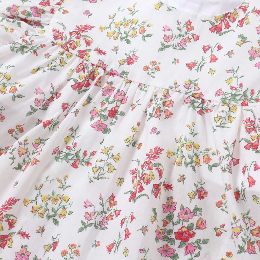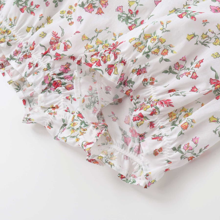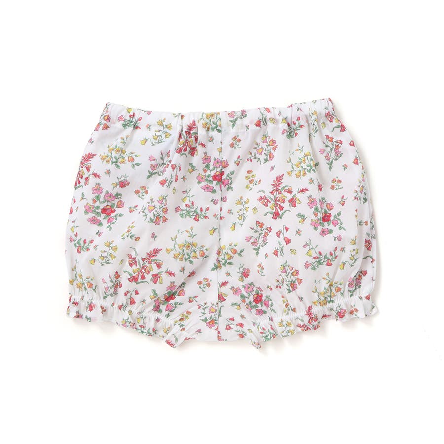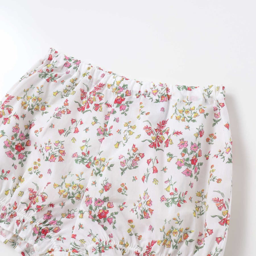明るい小花柄のリバティプリントが赤ちゃんのお顔を華やかに引き立て、袖や裾にあしらわれたフリルが可愛らしさを添えるワンピースとブルマのセット。