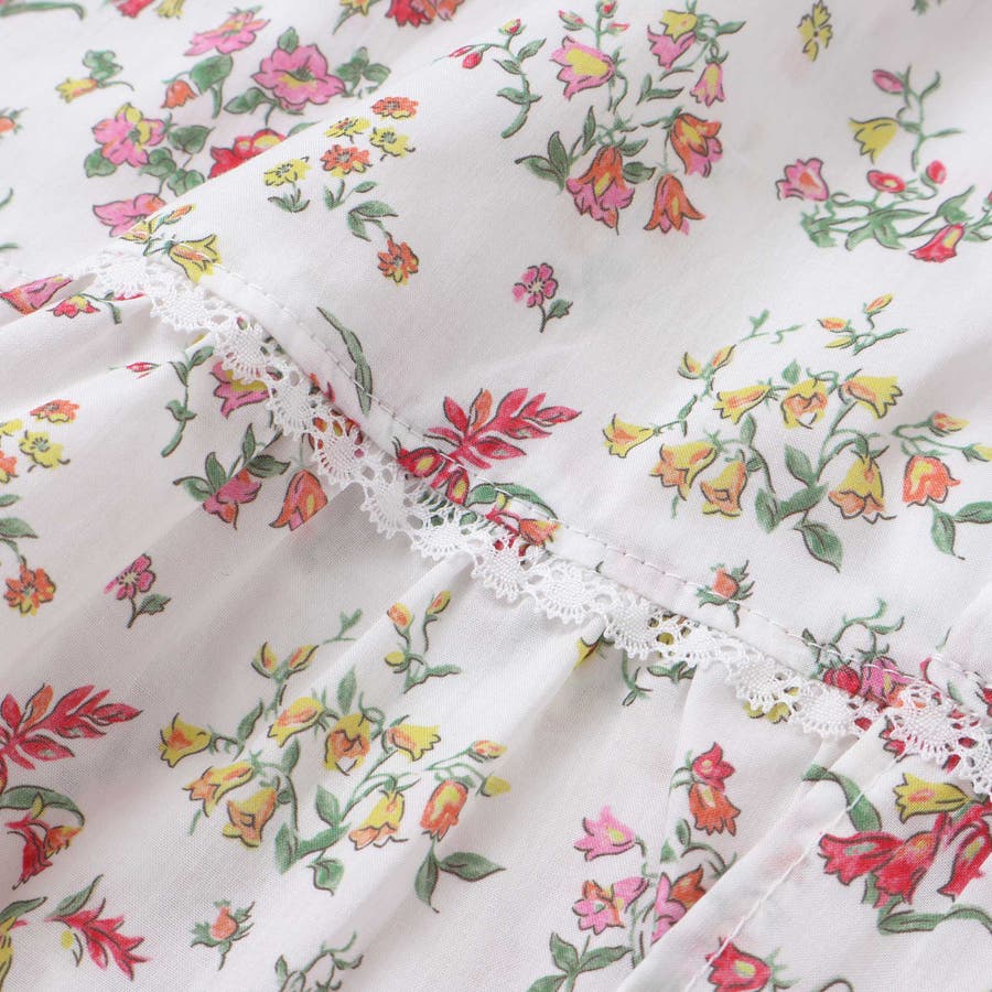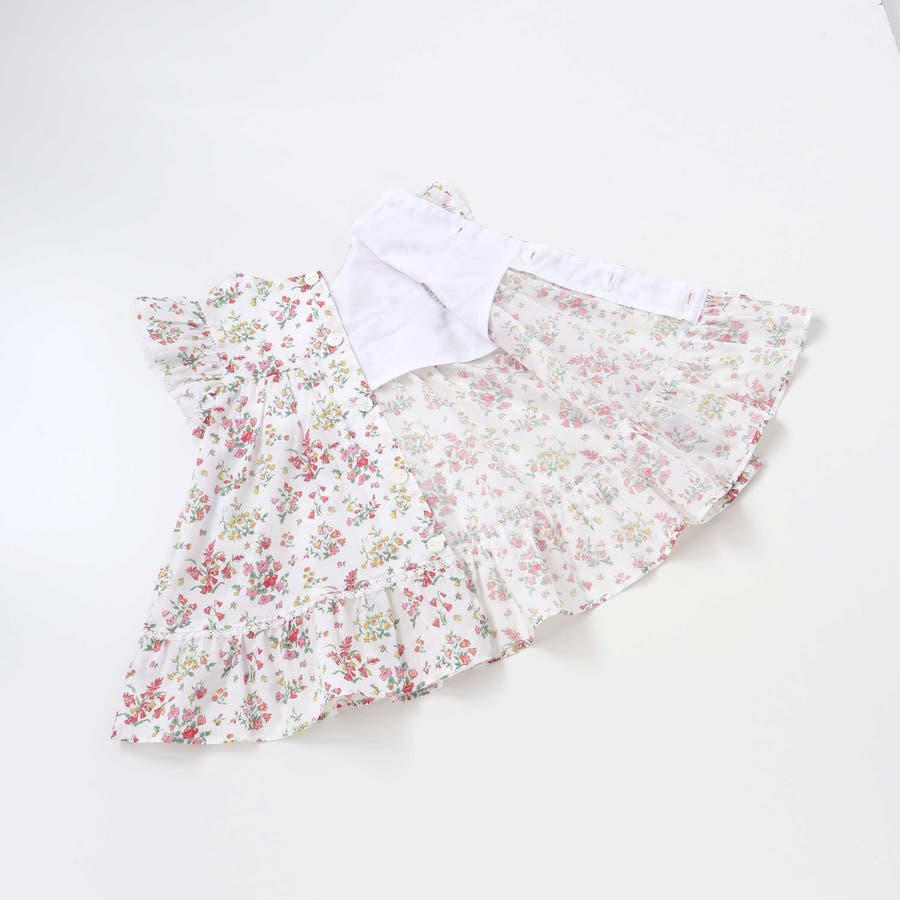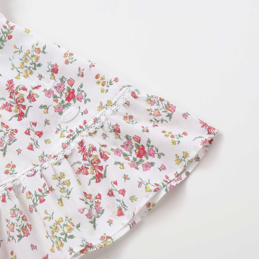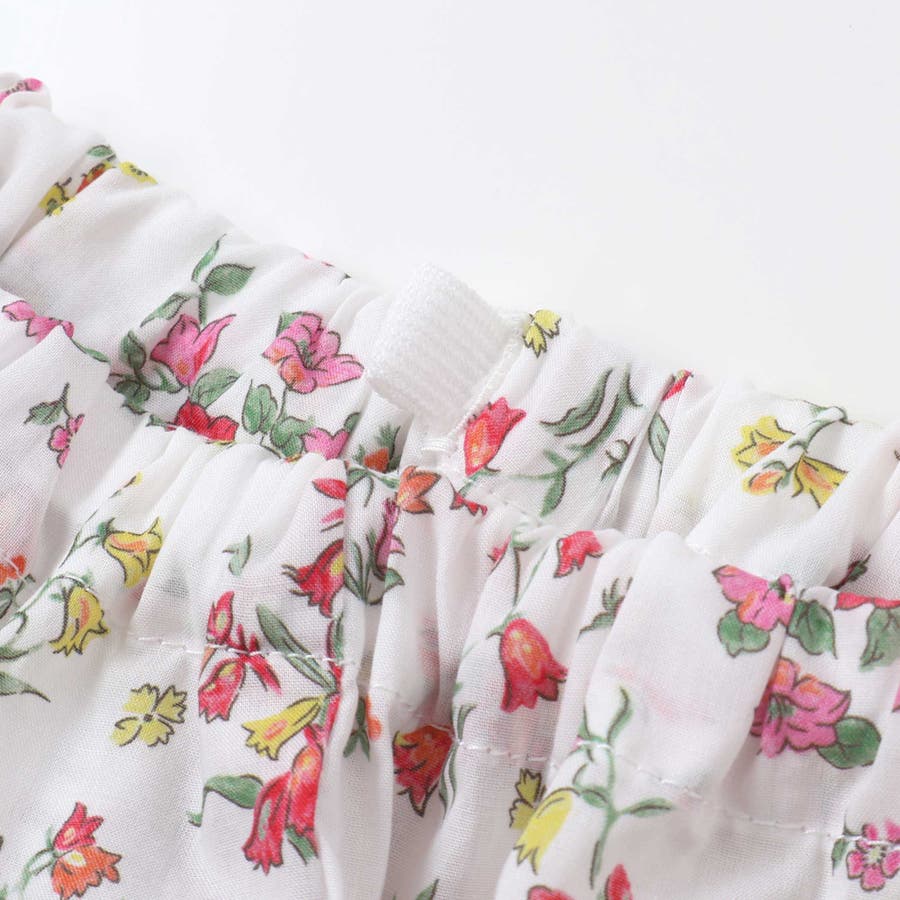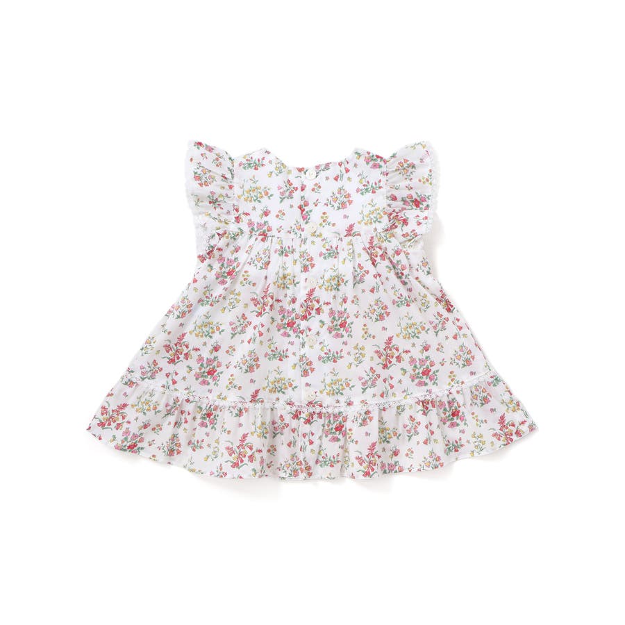 明るい小花柄のリバティプリントが赤ちゃんのお顔を華やかに引き立て、袖や裾にあしらわれたフリルが可愛らしさを添えるワンピースとブルマのセット。
