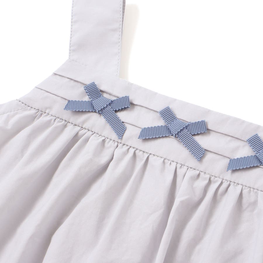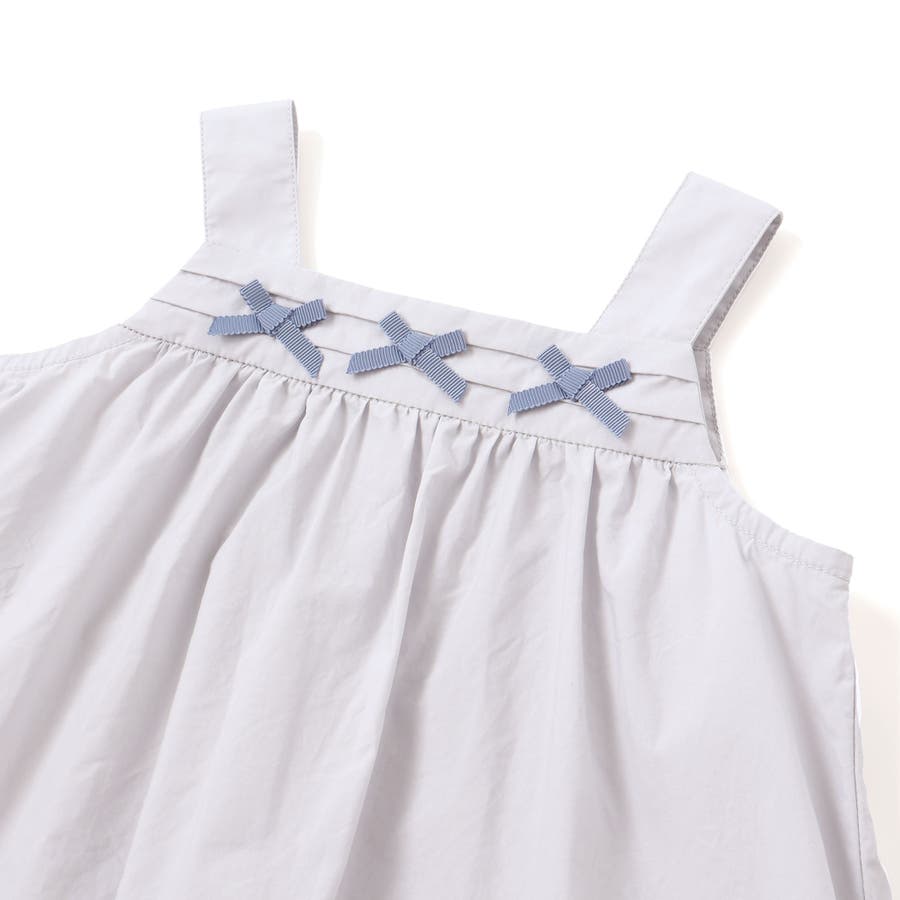 ハリのあるタイプライター生地にピンタックでギャザーを寄せて広がりのあるシルエットと3つのリボンが特徴のワンピースとブルマのセットです。