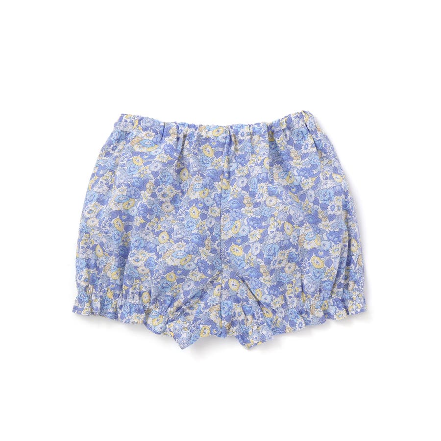 リバティプリントの生地を使用し、フリル袖とスモッキング刺しゅうでギャザーを寄せたワンピースとブルマの2点セット。