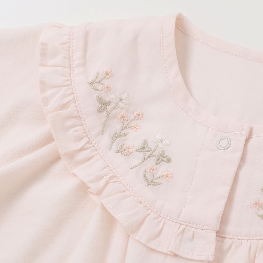 優しいカラーと胸元の刺しゅうが目を引くデザイン。