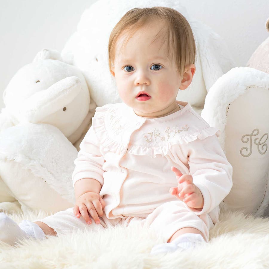 赤ちゃんらしいソフトなオフホワイトとピンクの2色展開です。