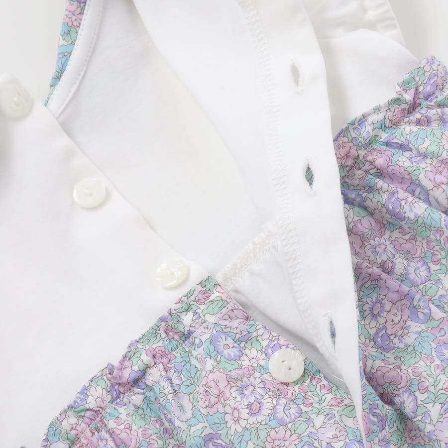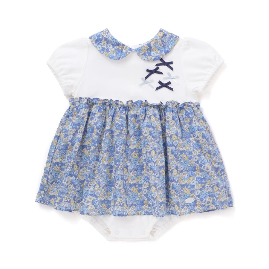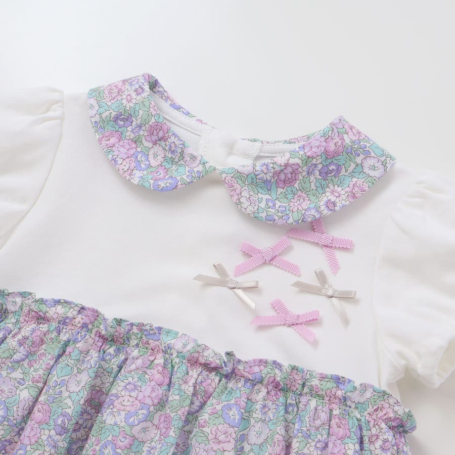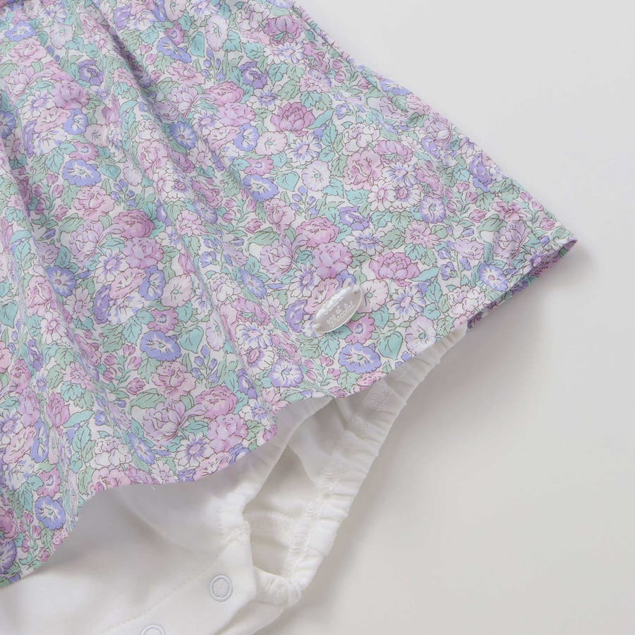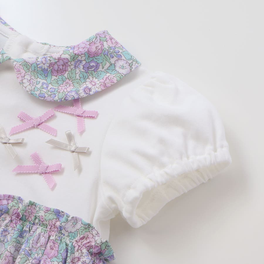 襟とスカート部分にリバティ(leontyne dream)を使用し、胸元のたくさんのリボンとパフスリーブで可愛さいっぱいのカバーオールです。