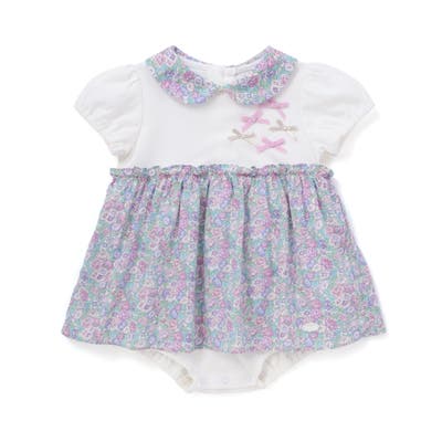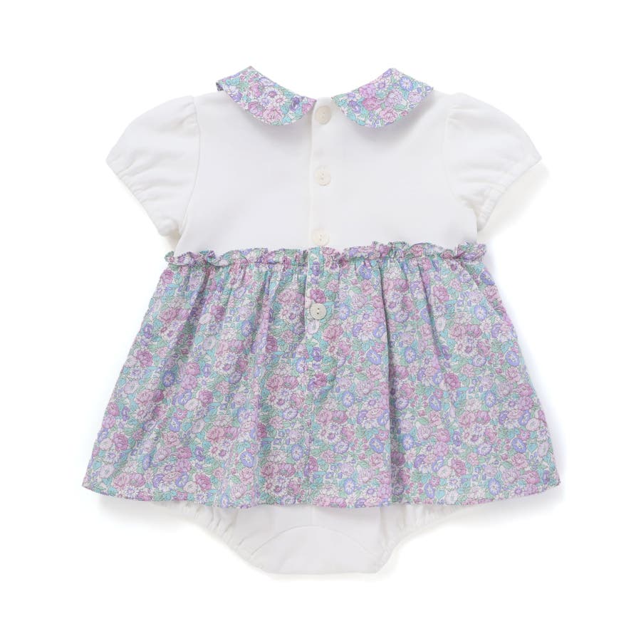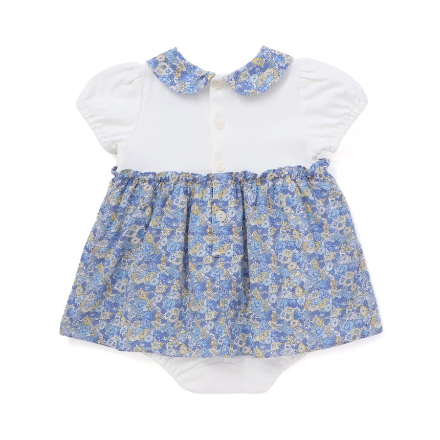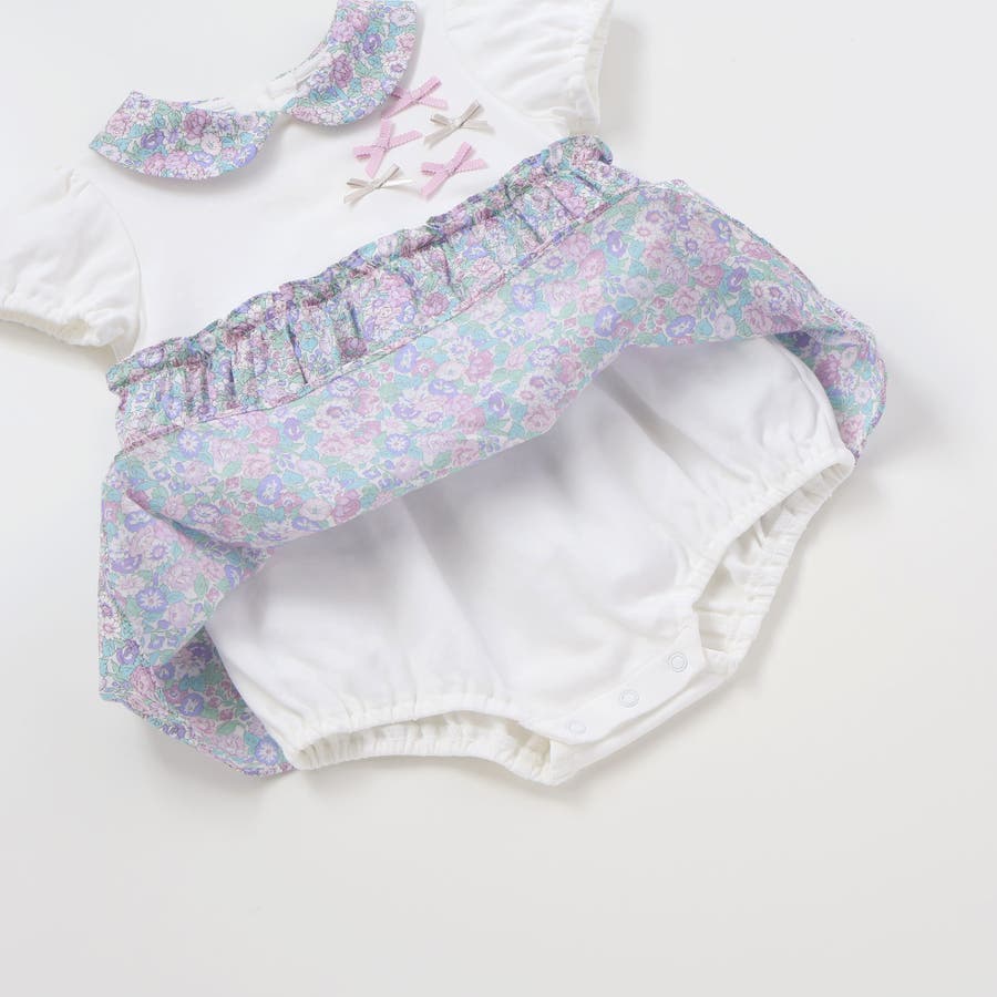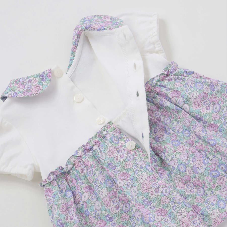 襟とスカート部分にリバティ(leontyne dream)を使用し、胸元のたくさんのリボンとパフスリーブで可愛さいっぱいのカバーオールです。