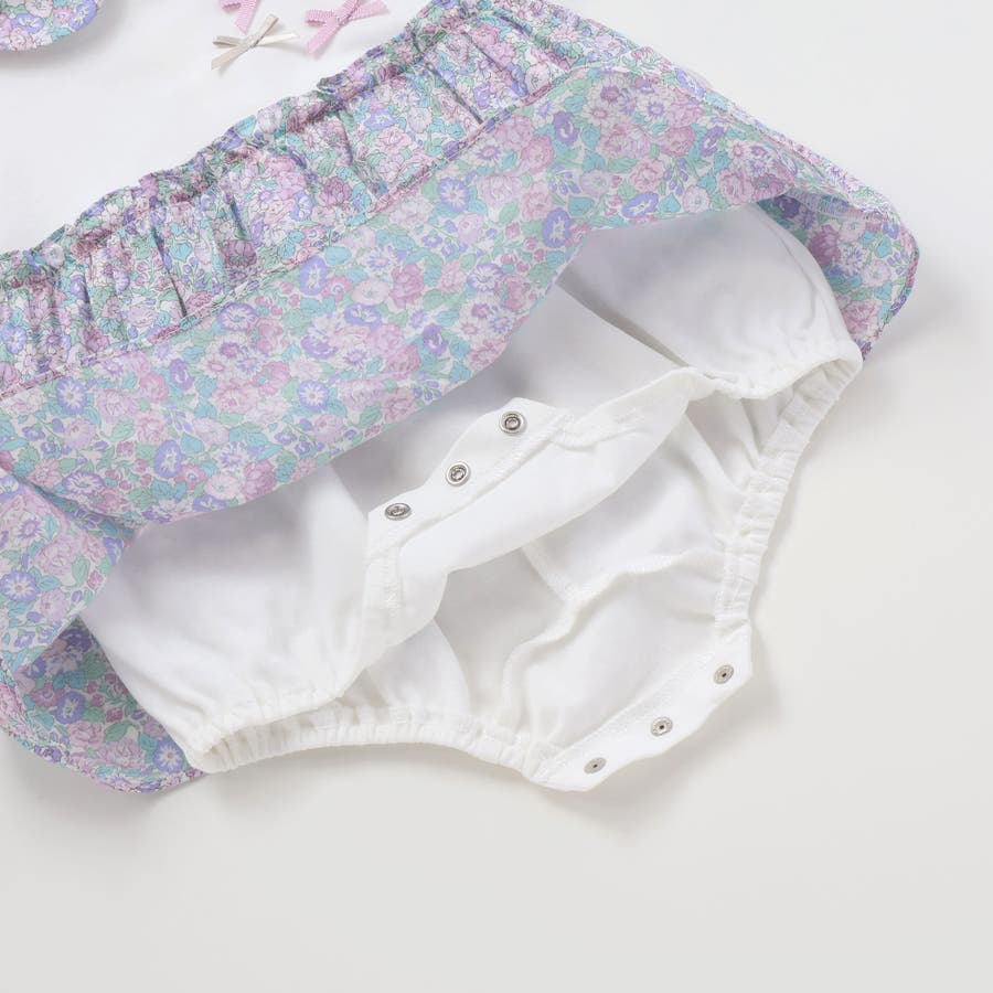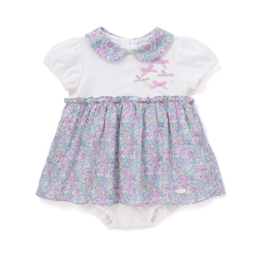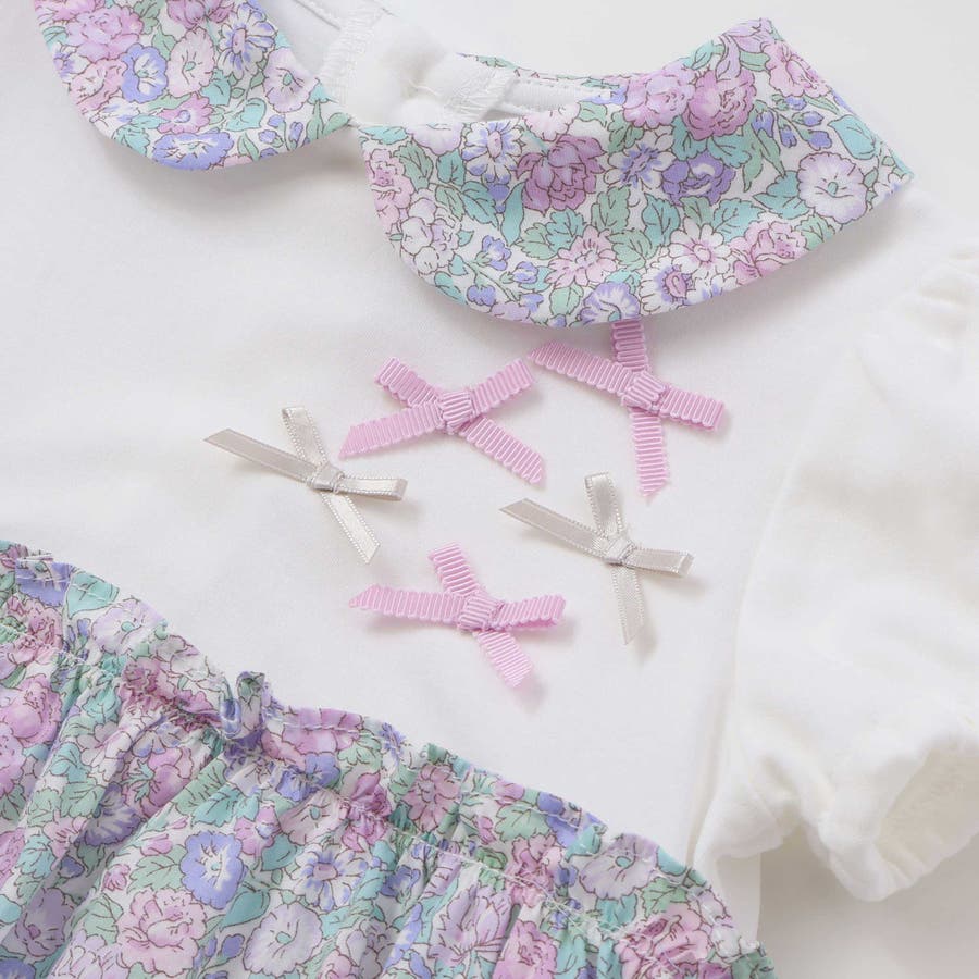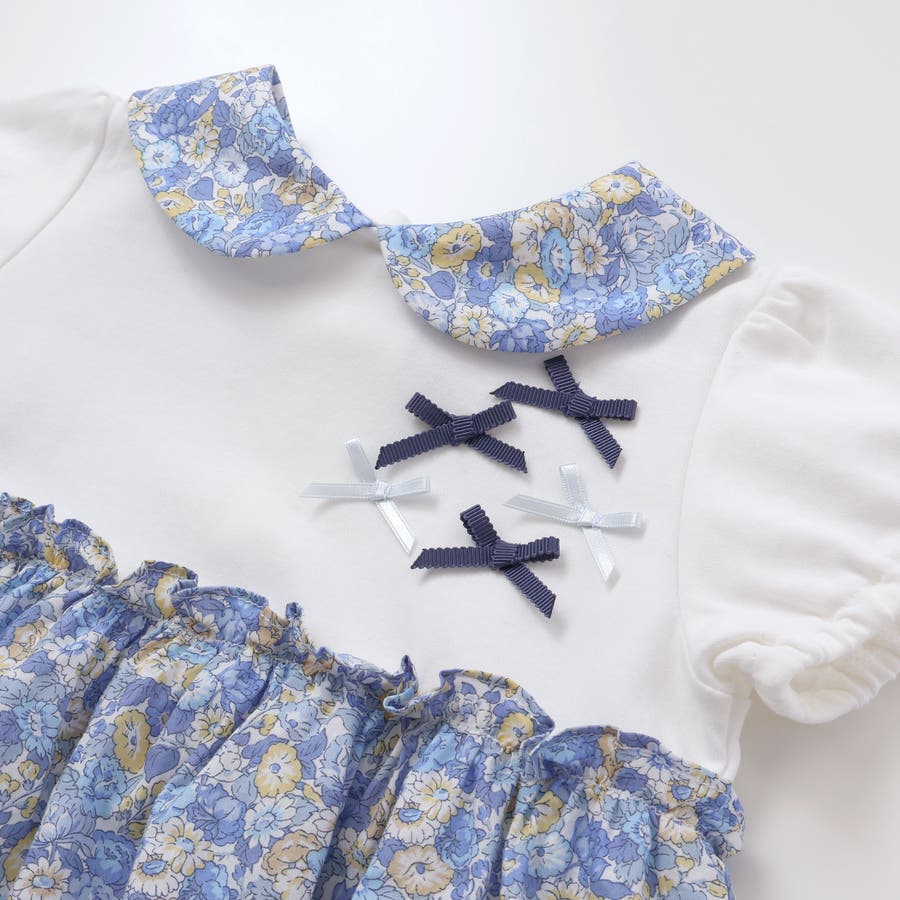 春夏らしい爽やかな印象のリバティプリント(leontyne dream)を選び、沢山のリボンとパフスリーブで可愛らしさをプラスしたデザイン。