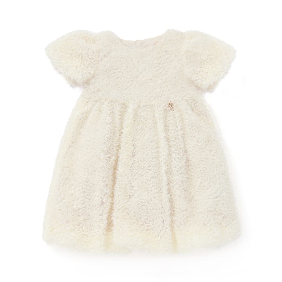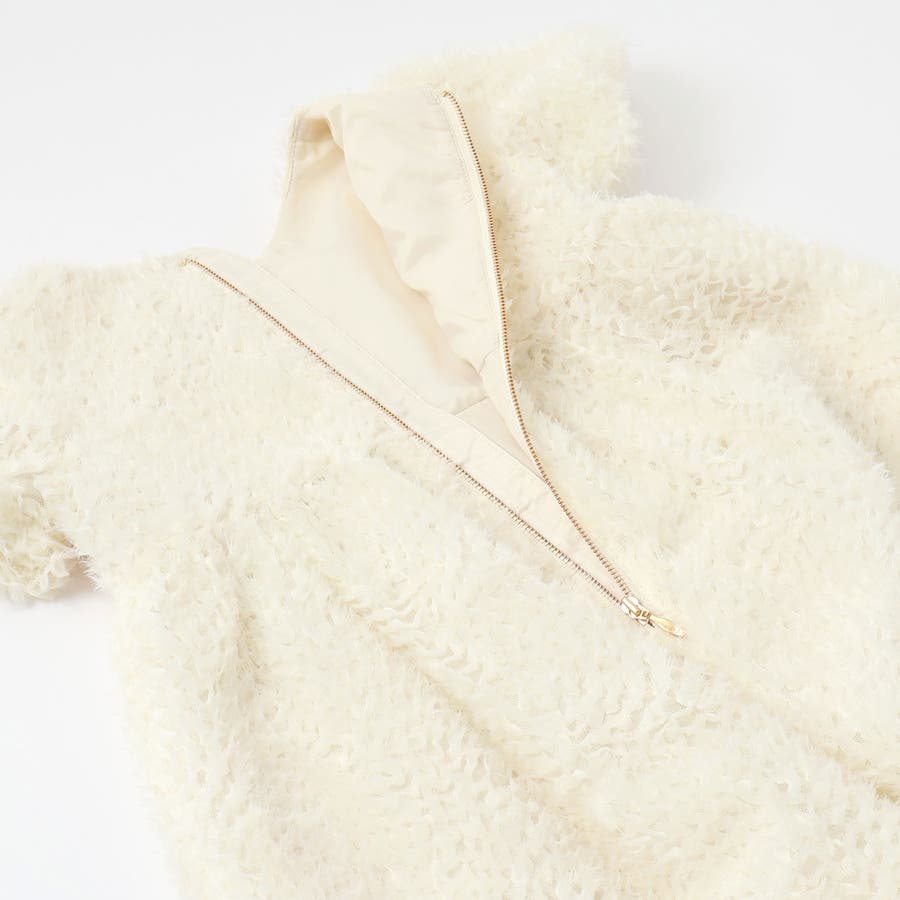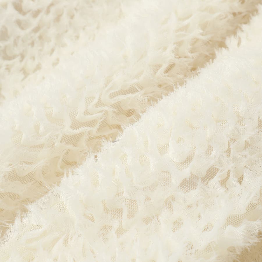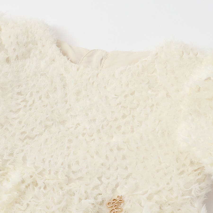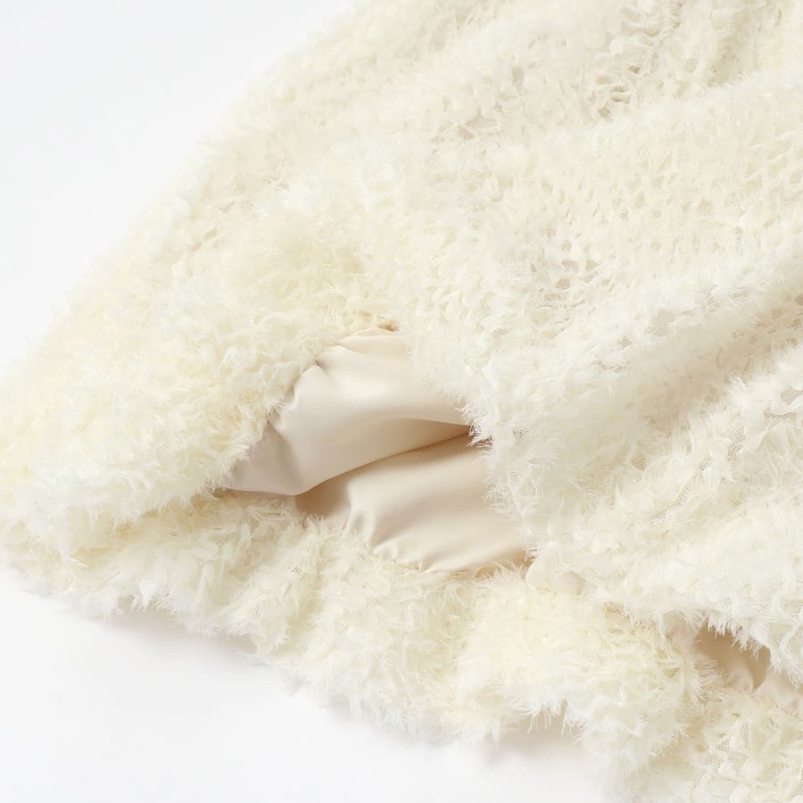ふわふわとしたフェザーのような見た目のテープチュールの細かなフリルが目を引くデザイン。