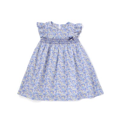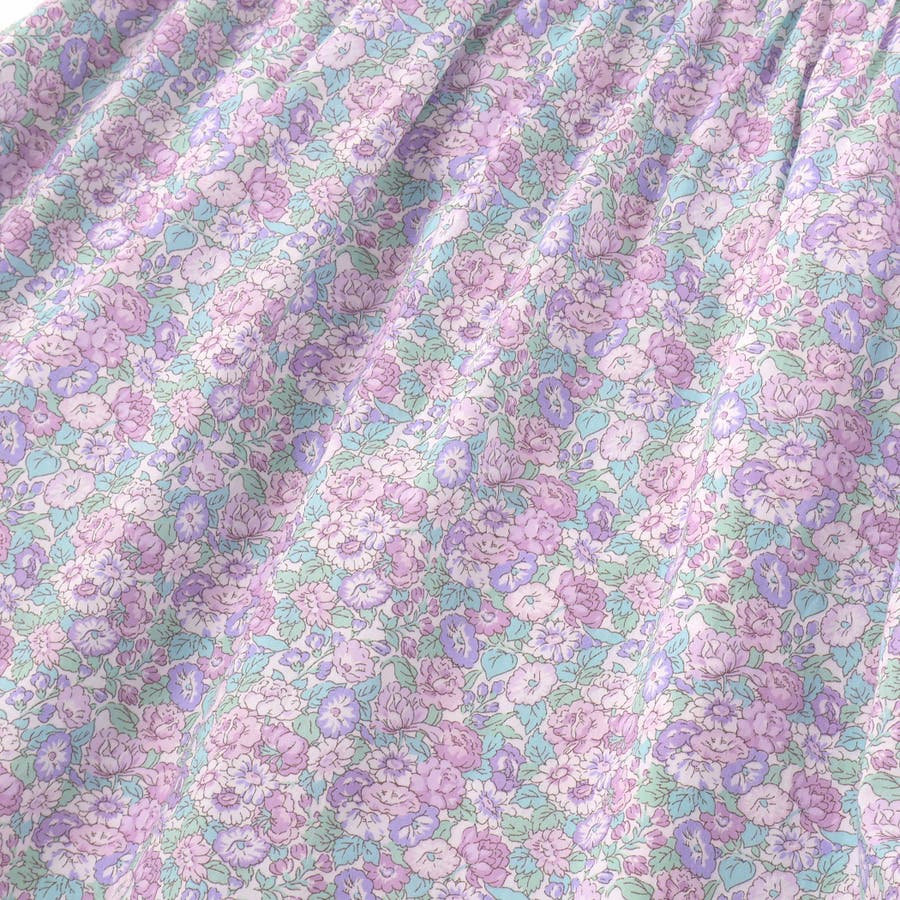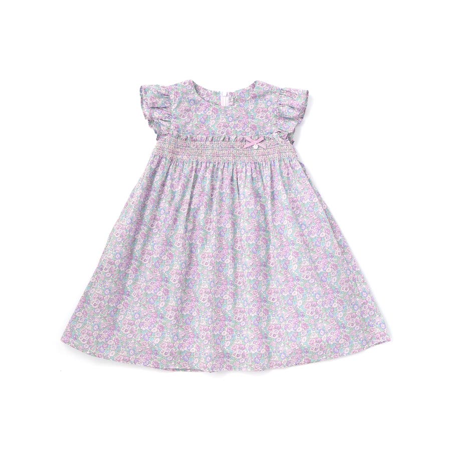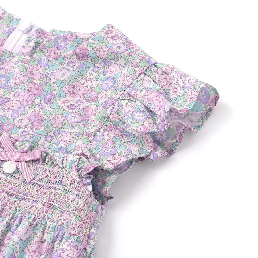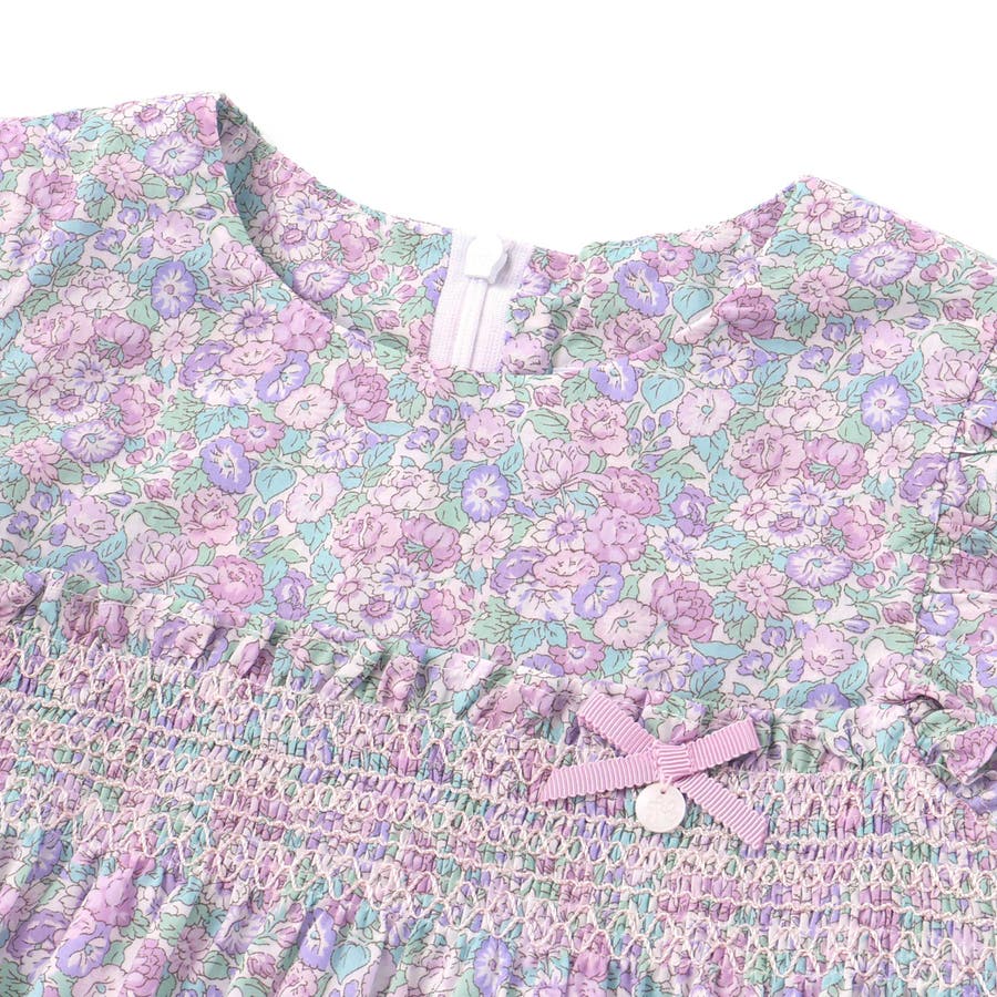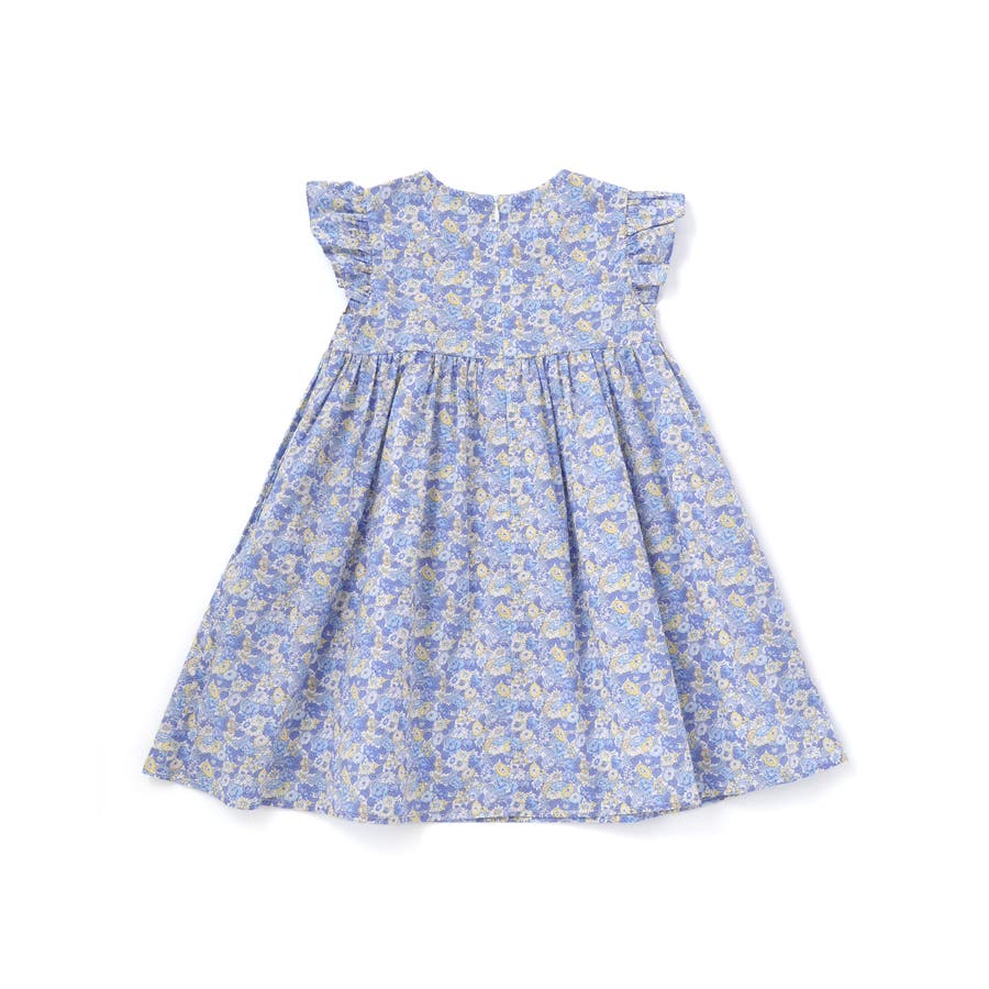 胸元からスモッキングでギャザーを寄せてふんわりと広がるシルエットがリバティ柄の良さを引き立てます。