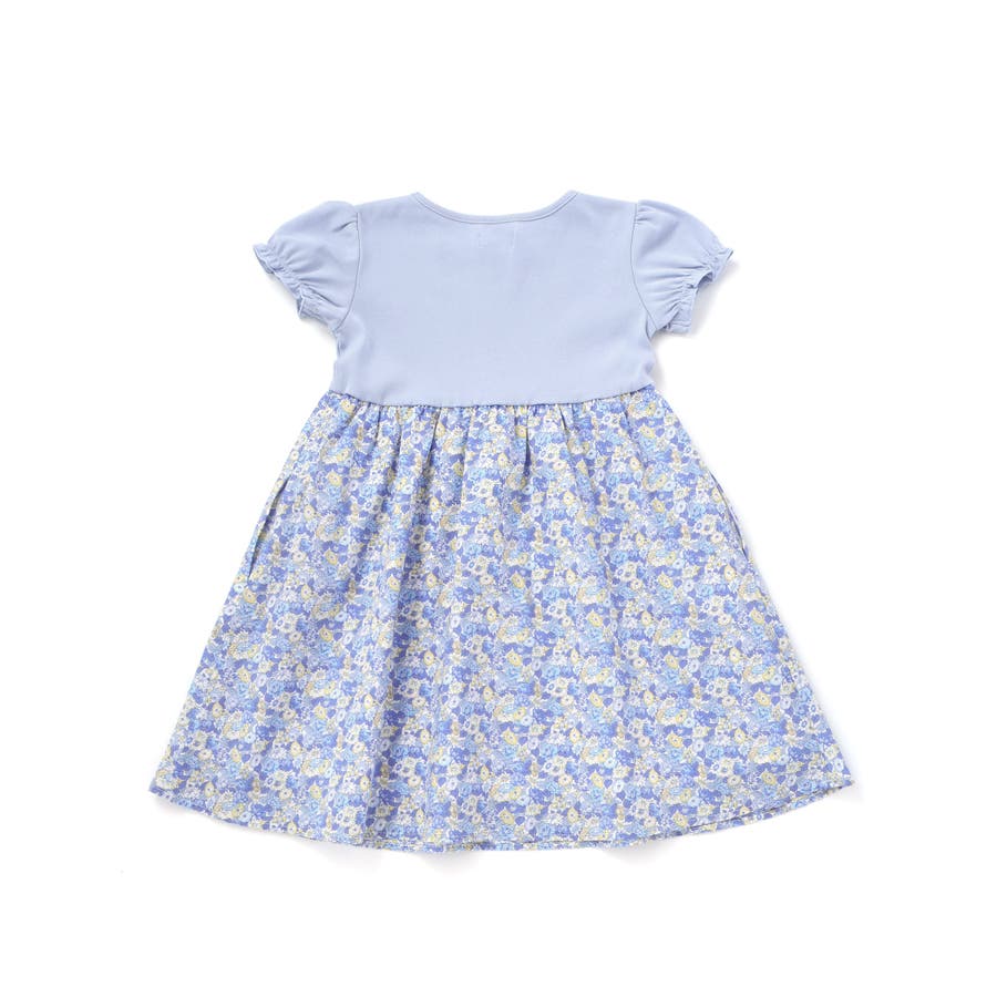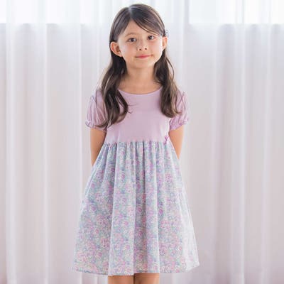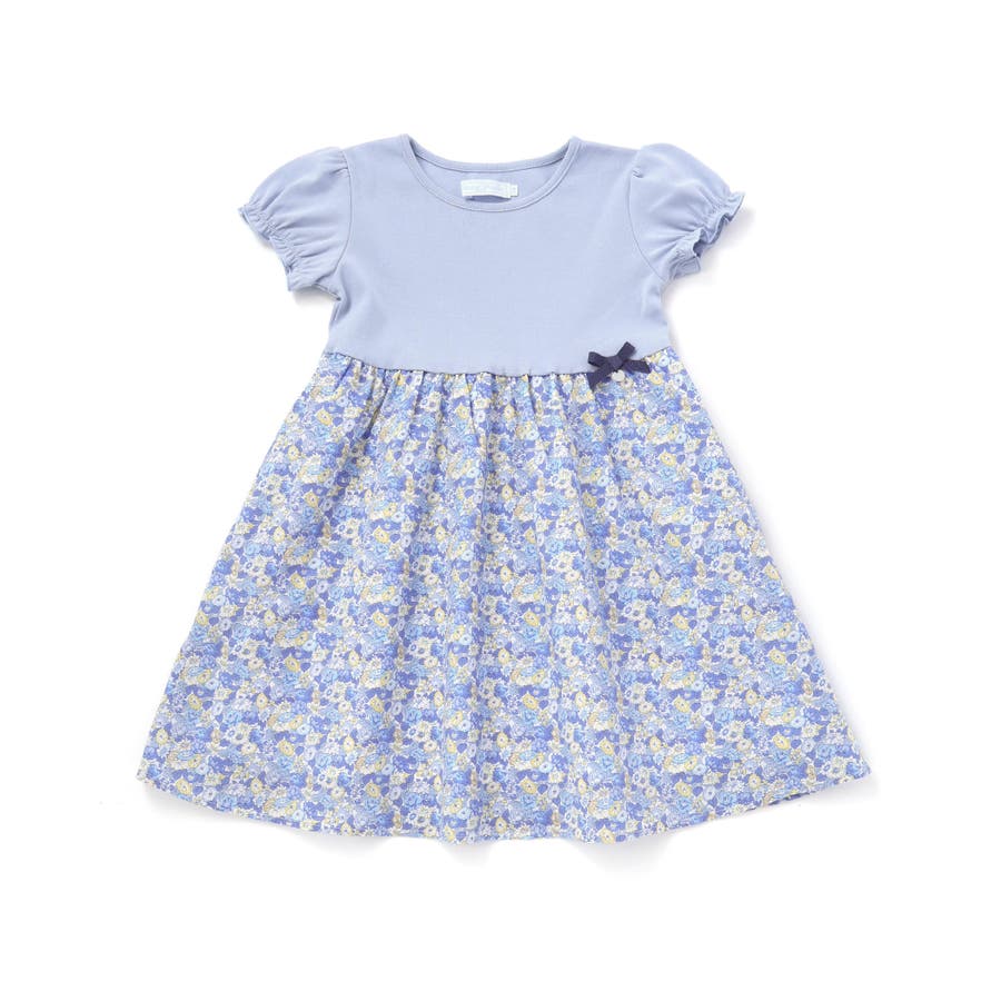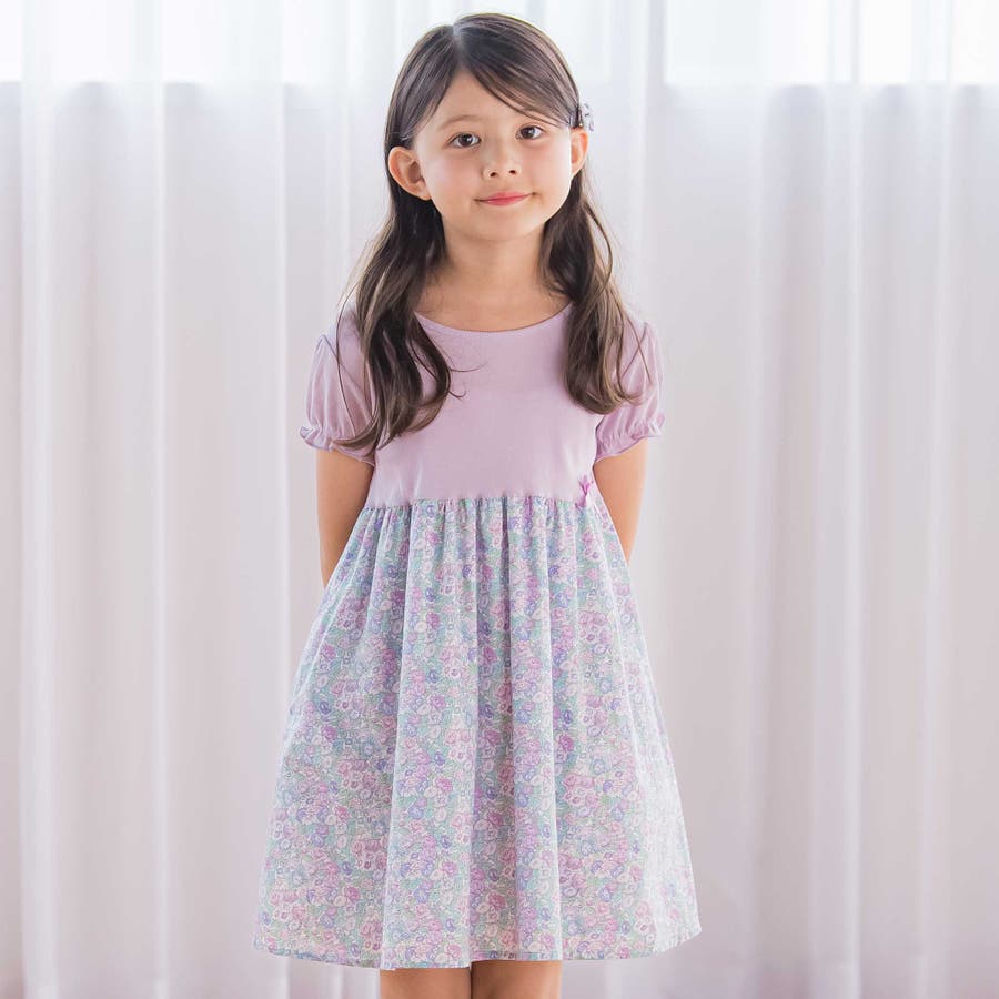 毛羽立ちを抑えたフライス生地とタナローンのリバティプリントの生地を切り替えたデザインの女の子用ワンピースです。