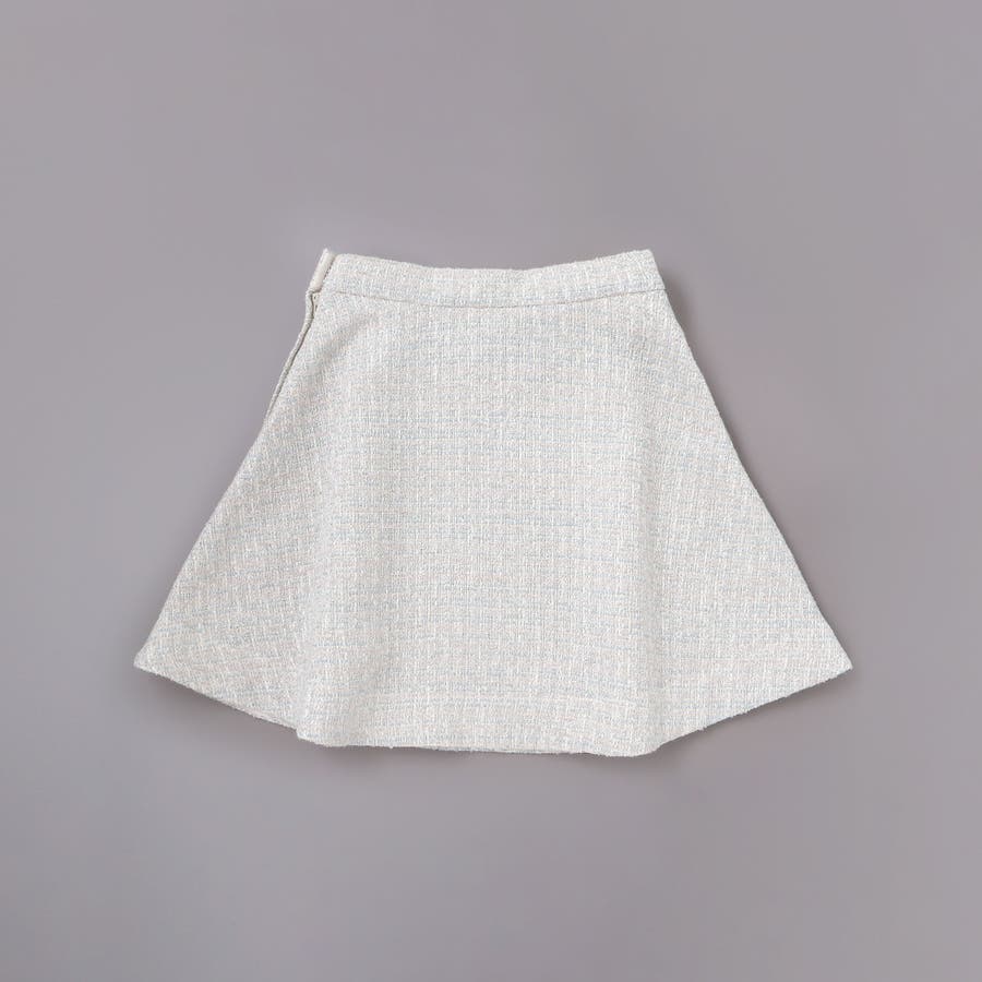 ラメ入りツイード素材を使用した、華やかなジャケットとスカートのセットアップスーツ。