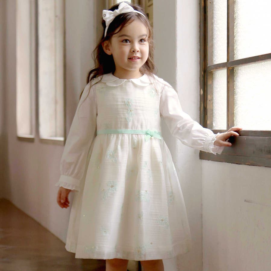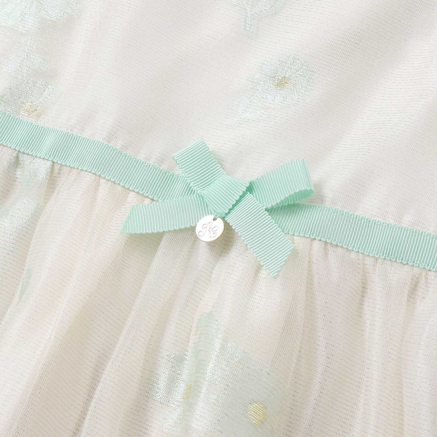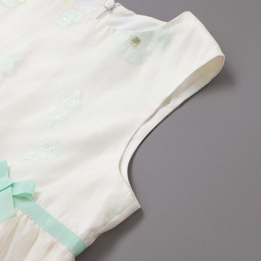 ウエストの切り替えにはグログランテープのラインとリボンをあしらい、リボンにはチャームを添えて華やかさをプラス。