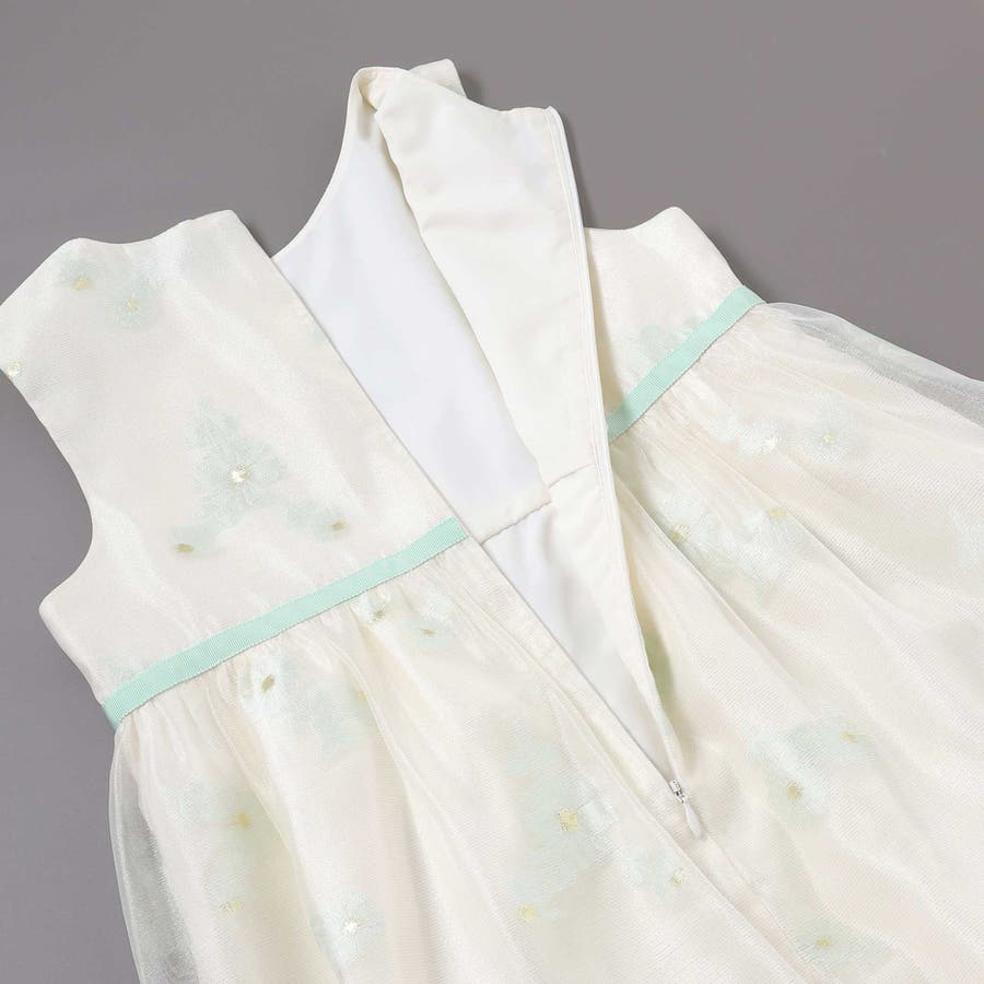 お花柄が散りばめられたラメオーガンジー素材を使用した華やかなジャンパースカート。