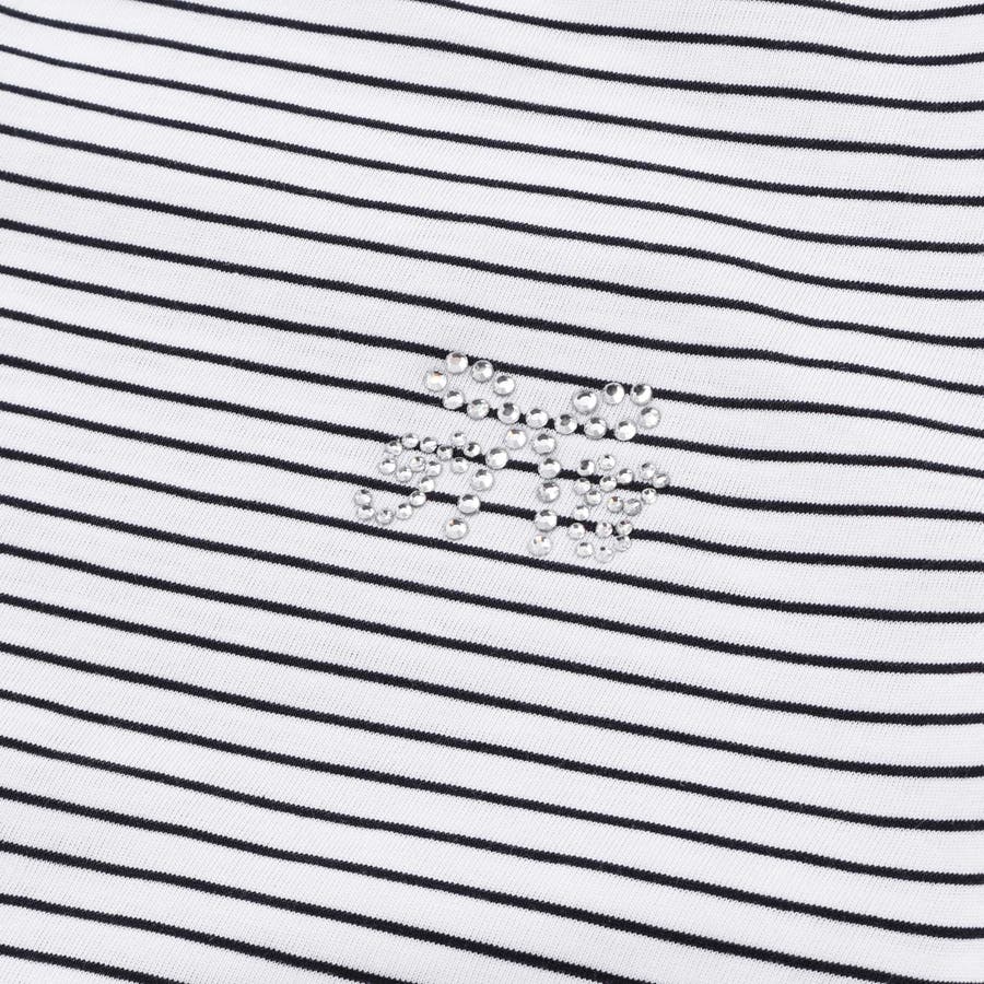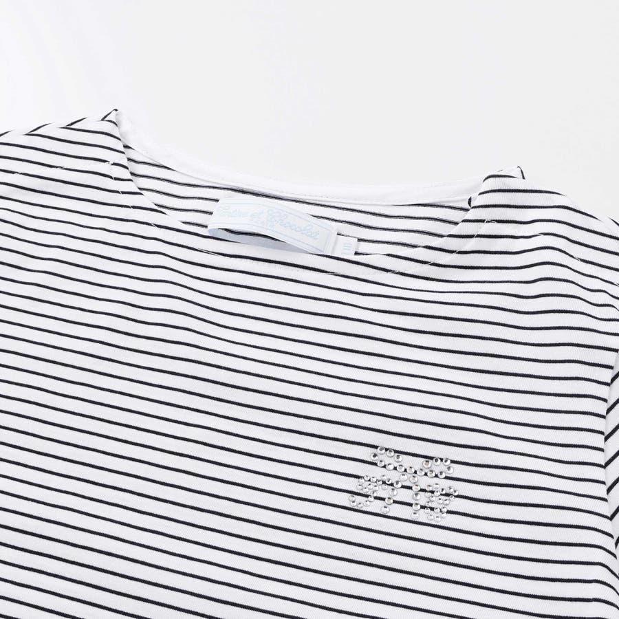 キラッとひかるラインストーンがポイントの女の子用ボーダー半袖Tシャツ。
