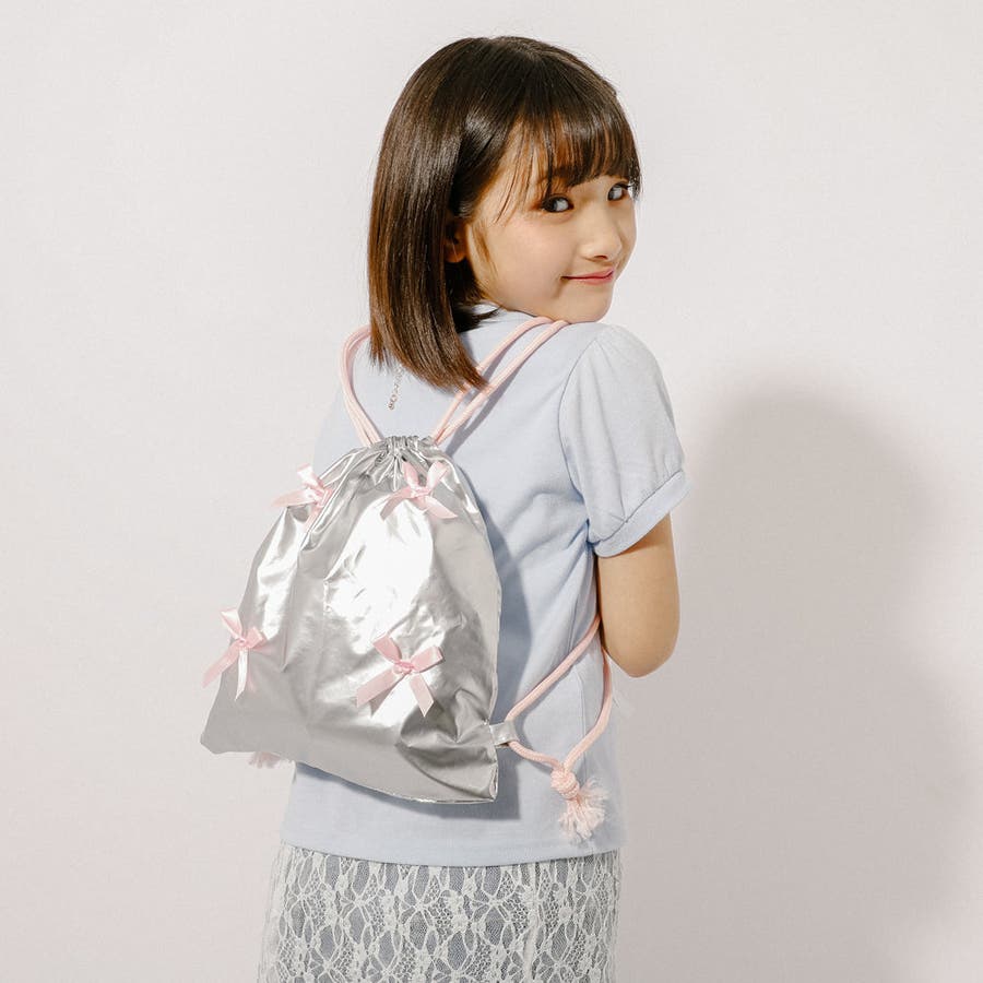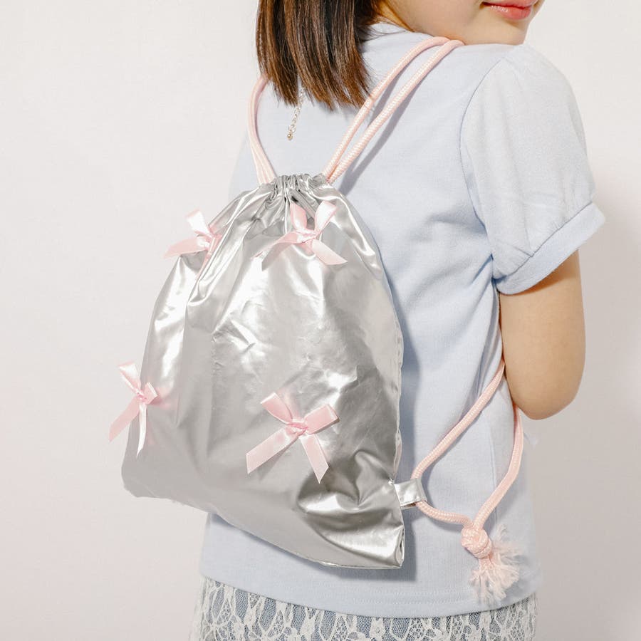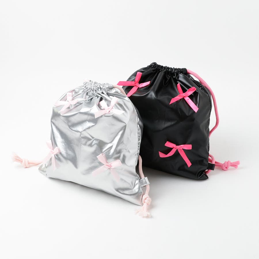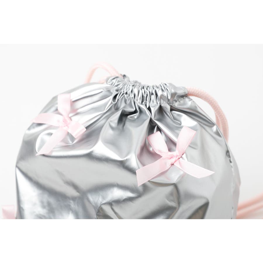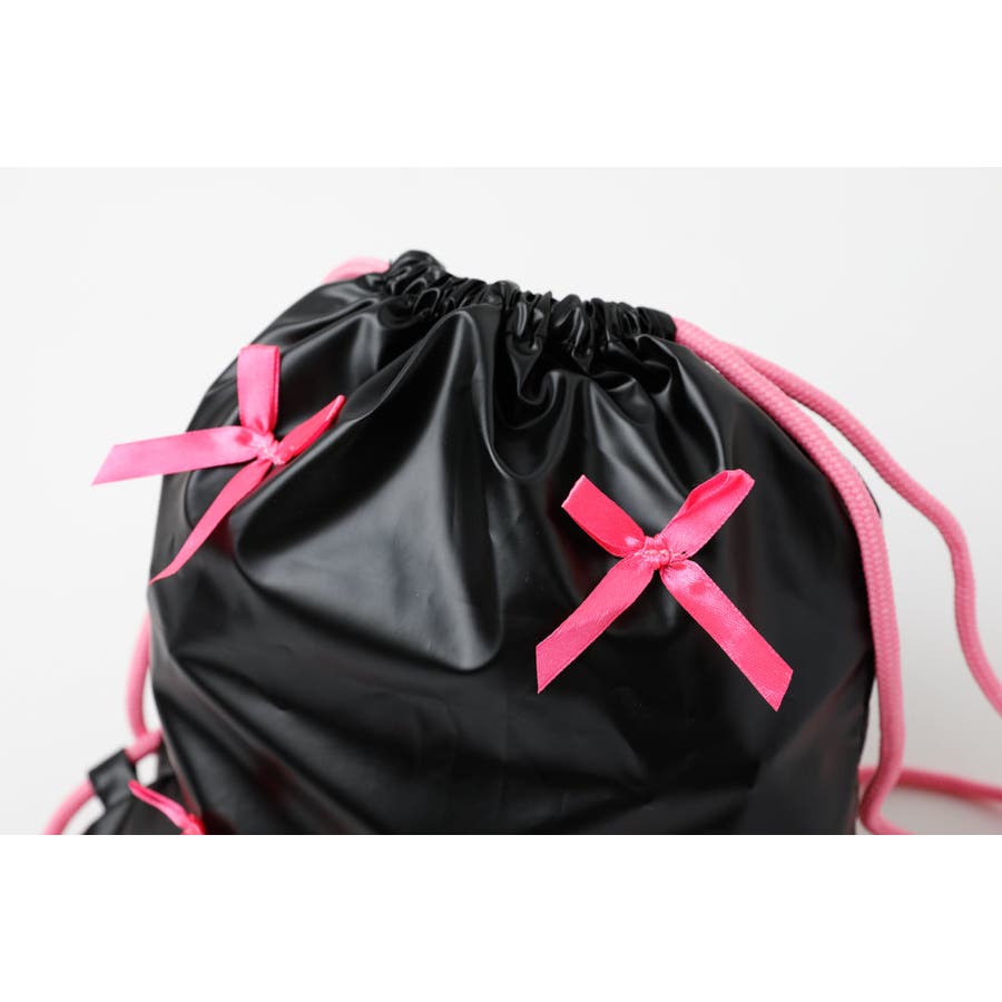 光沢感のあるナイロン素材とリボンデザインが可愛いナップサックは