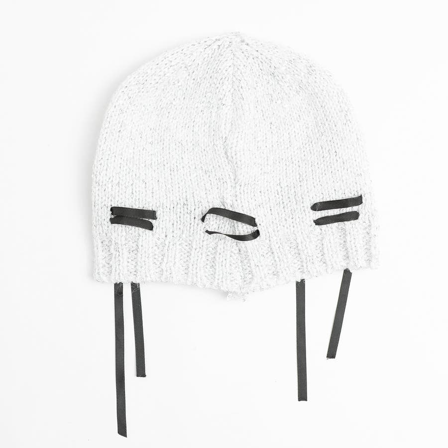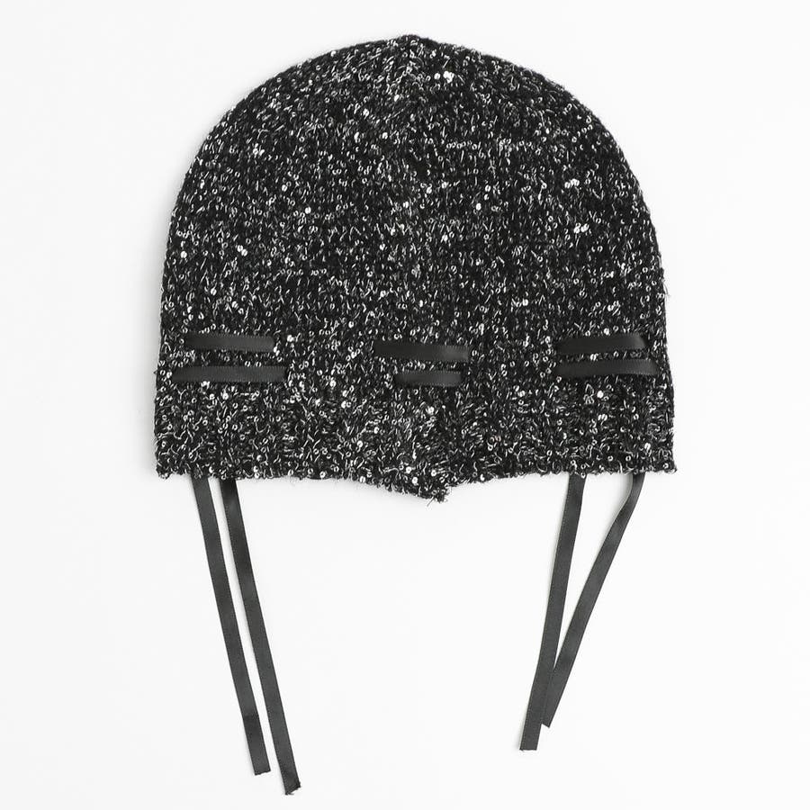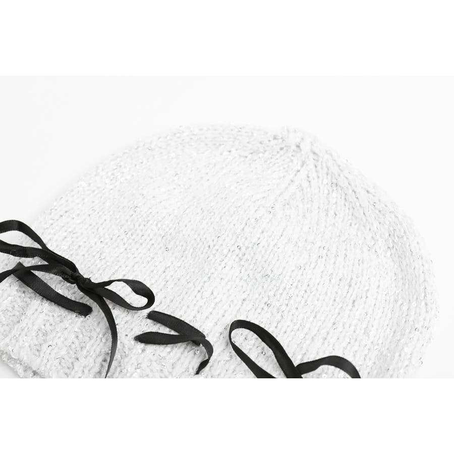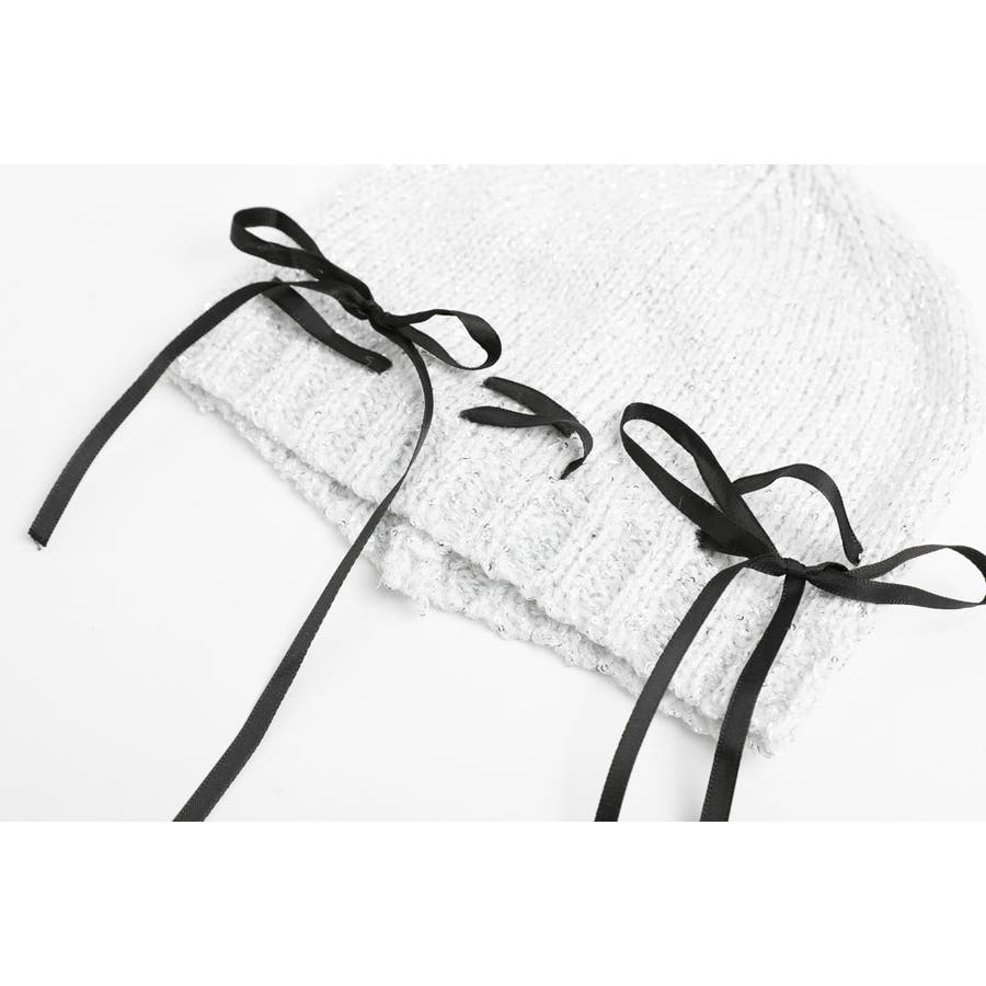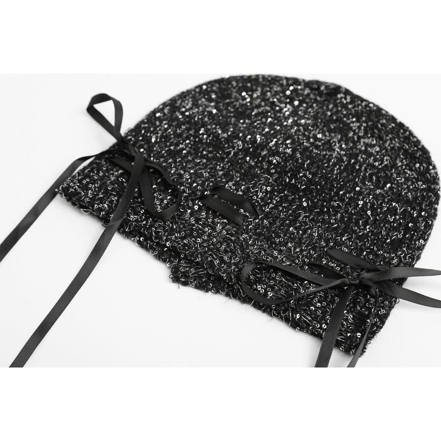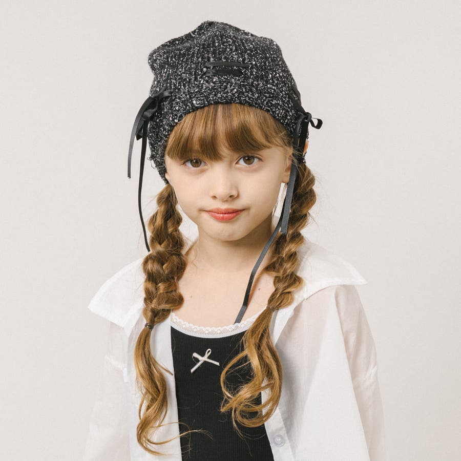 ラメ糸がきらきら光る編み上げリボンデザインビーニーキャップ。