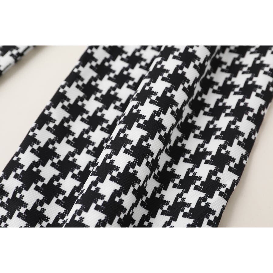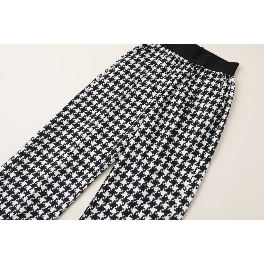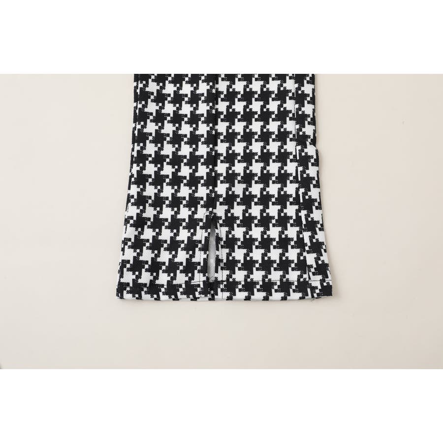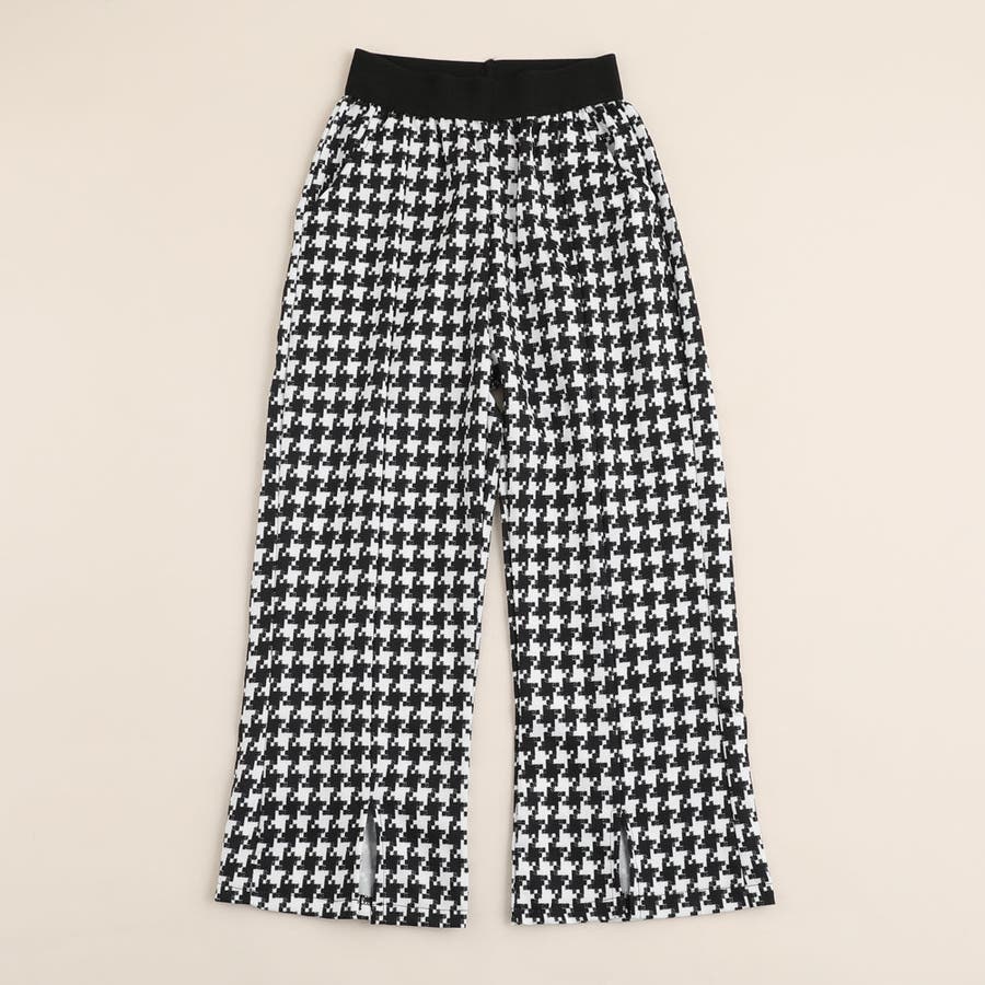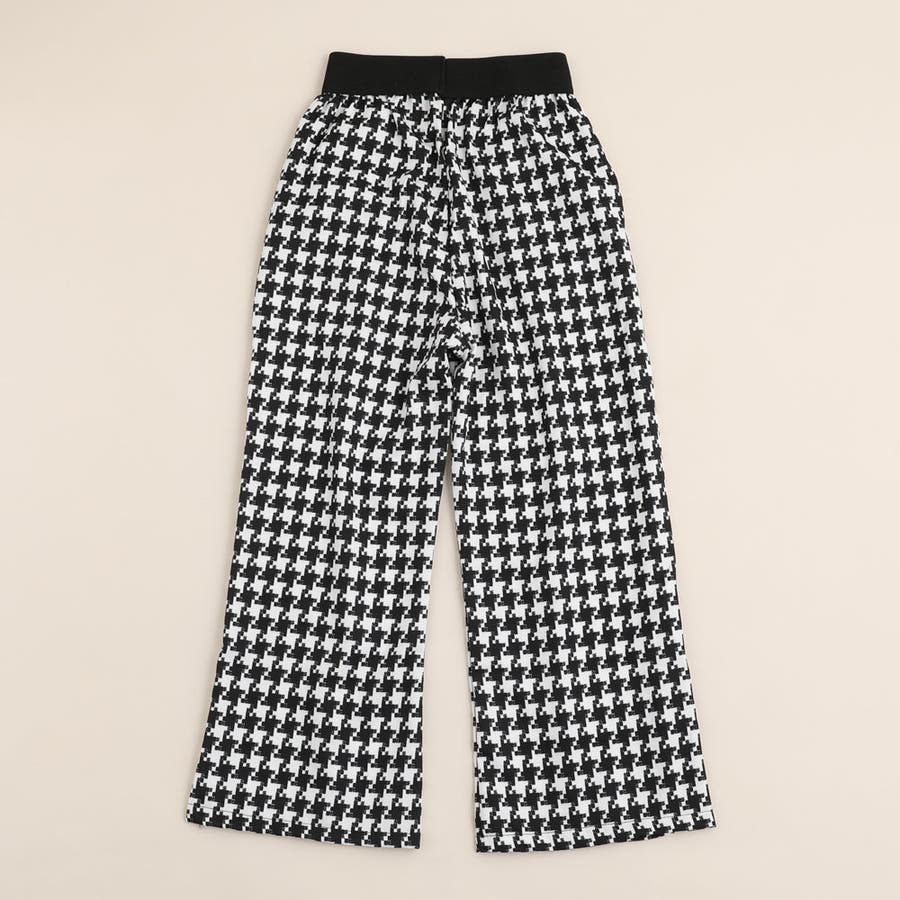トップスのハートロゴとパンツの千鳥柄を合わせることで、まとまったスタイリングを実現します。