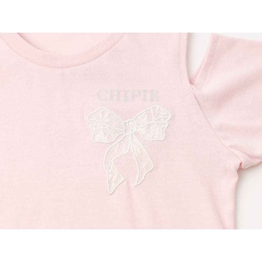 トレンドのリボンレース刺繍とラインストーンロゴが組み合わさったガーリーコーデにぴったりなTシャツ。