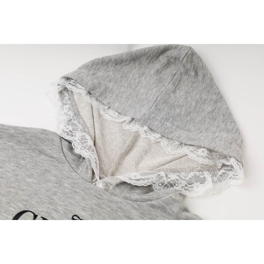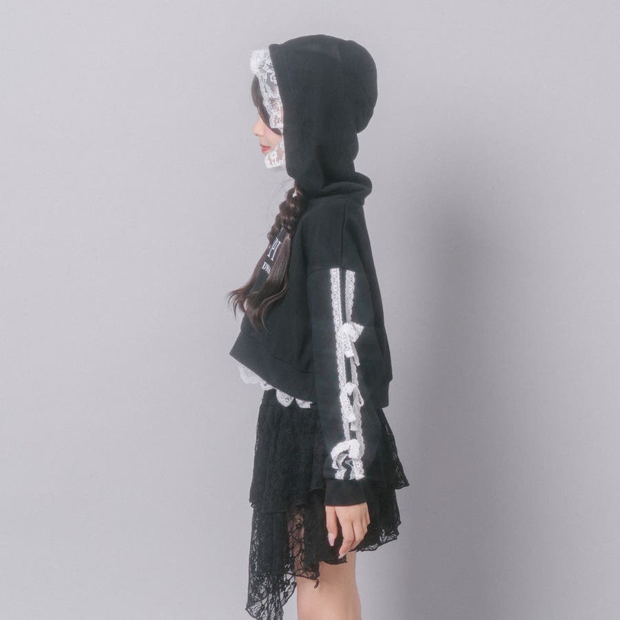 フリルレースを施したフードと裾が目を引くデザインフーディー。