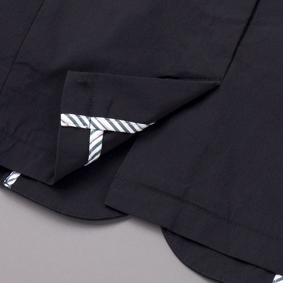 全体はブラックでまとめながら、裏地にはグリーン×白のストライプパイピングを採用。
