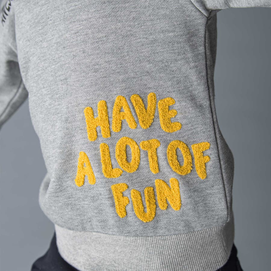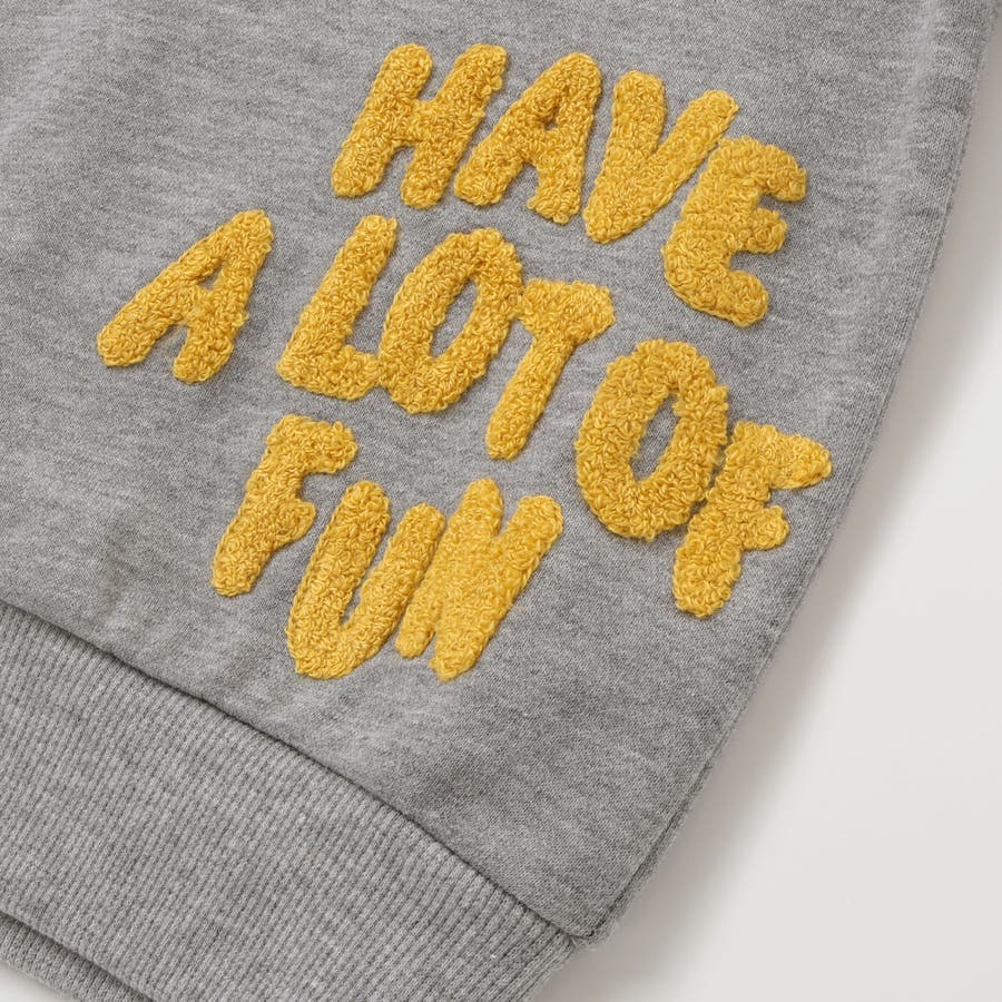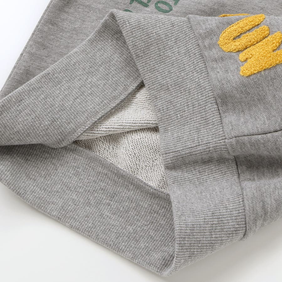 グレーはイエローの刺しゅうにブラック×グリーンのプリントを組み合わせ、元気でポップな印象に仕上げました。