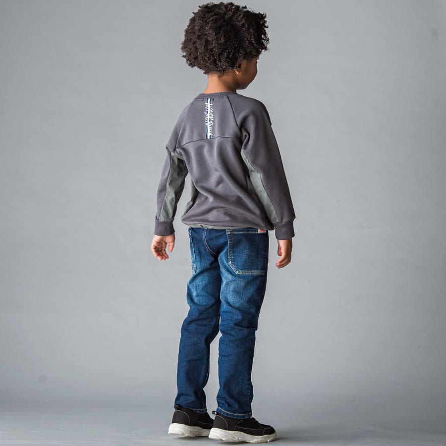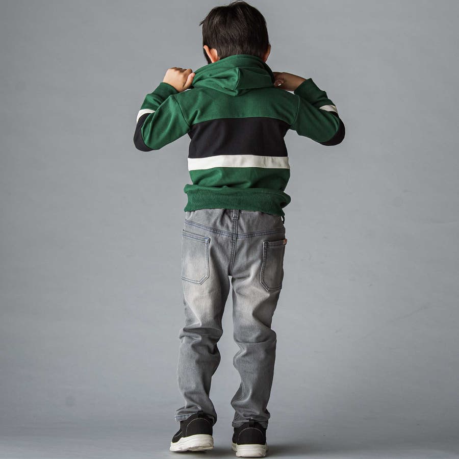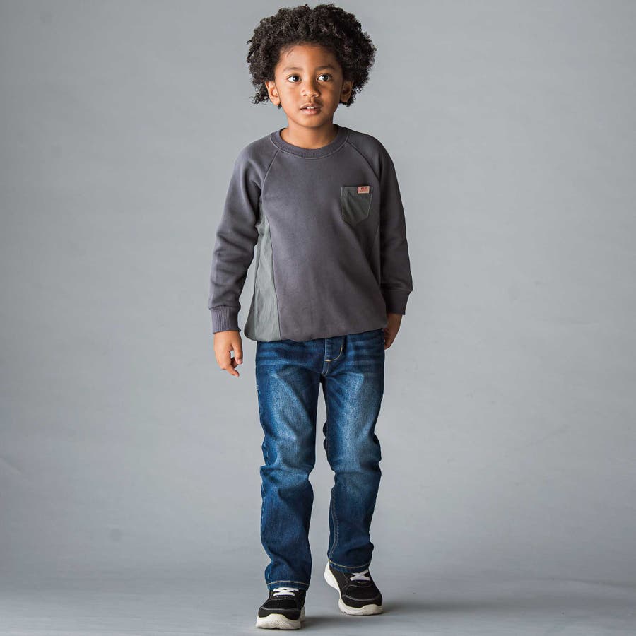 後ろのビッグポケットと配色ステッチが程よいアクセントとなり、男の子の元気さを自然に引き立てます。