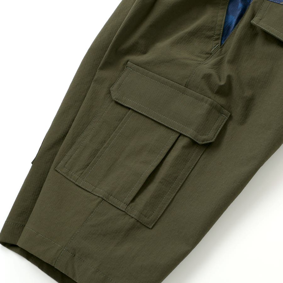 リップストップ素材を使用したガラ切り替え6分丈のカーゴパンツ。