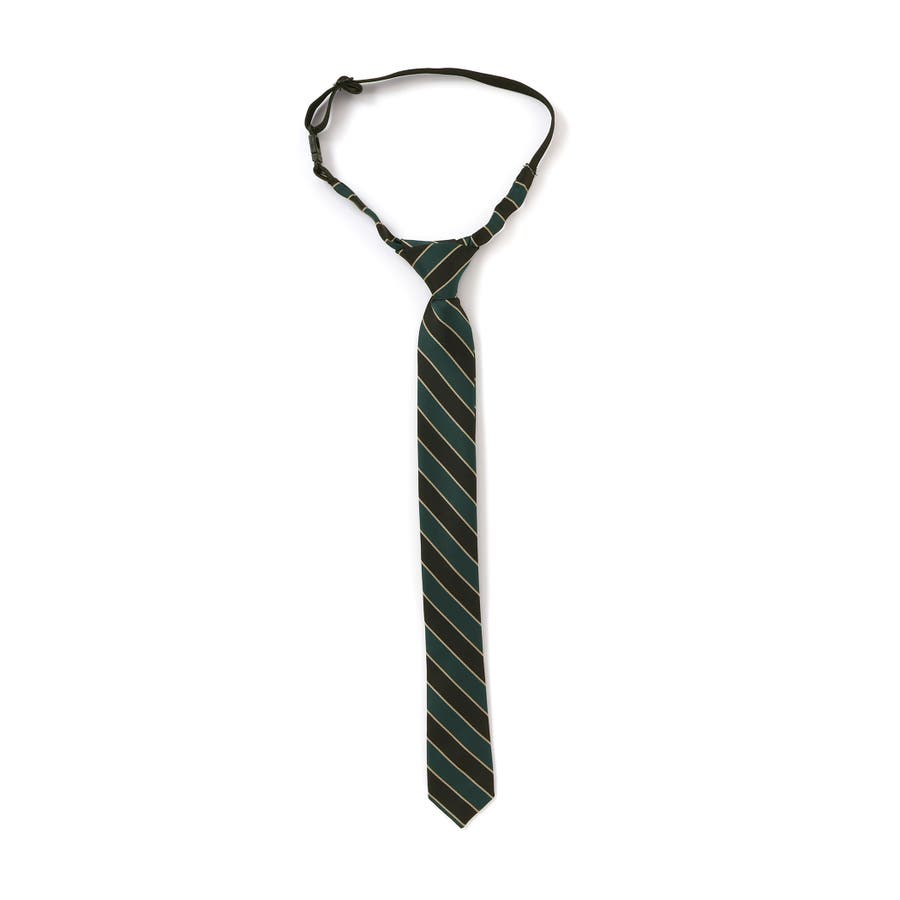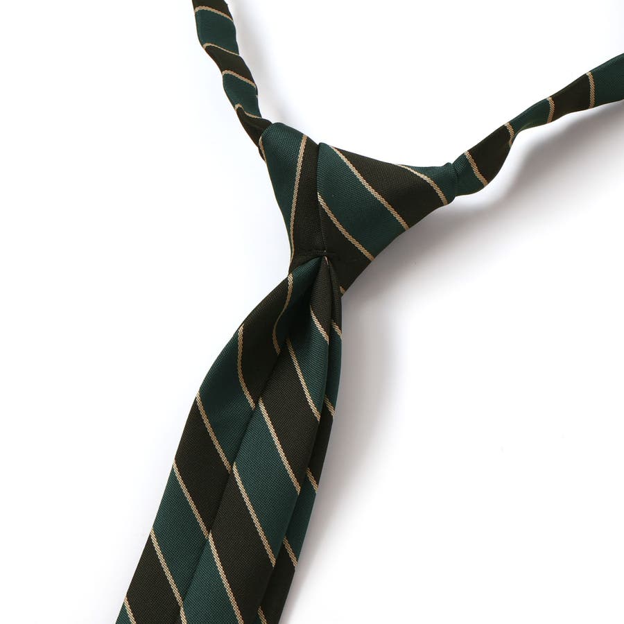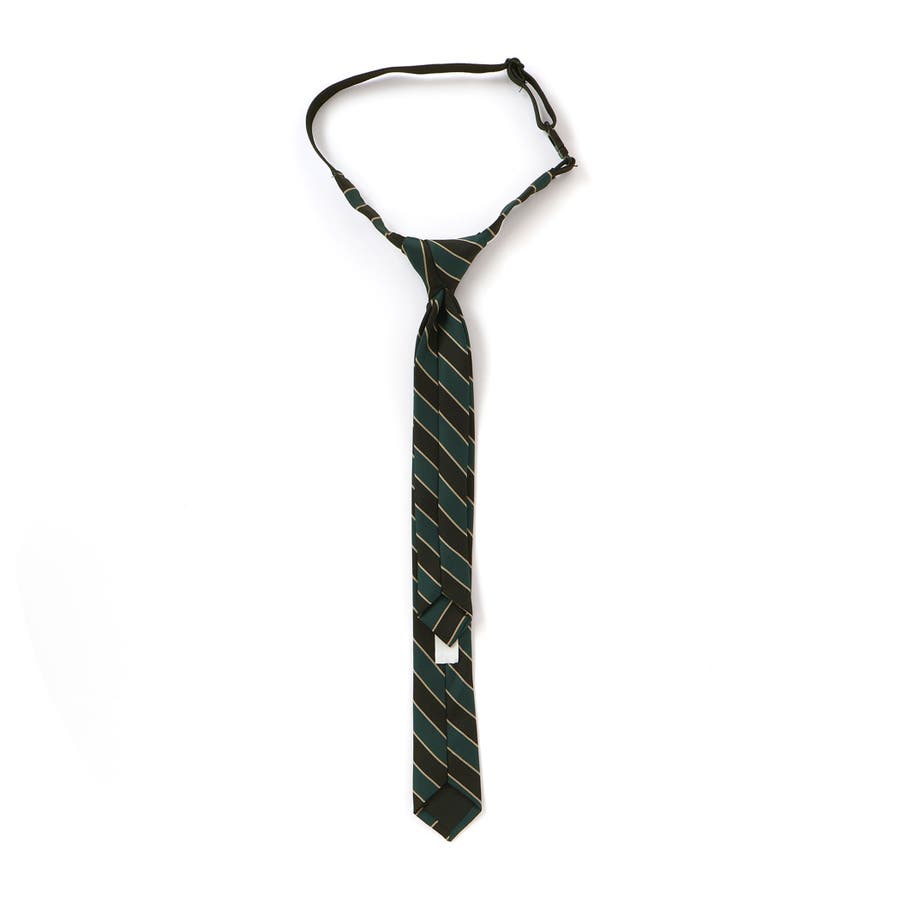 深みのあるグリーンにブラックとベージュのストライプを配した、上品でトラッドな印象のネクタイ。