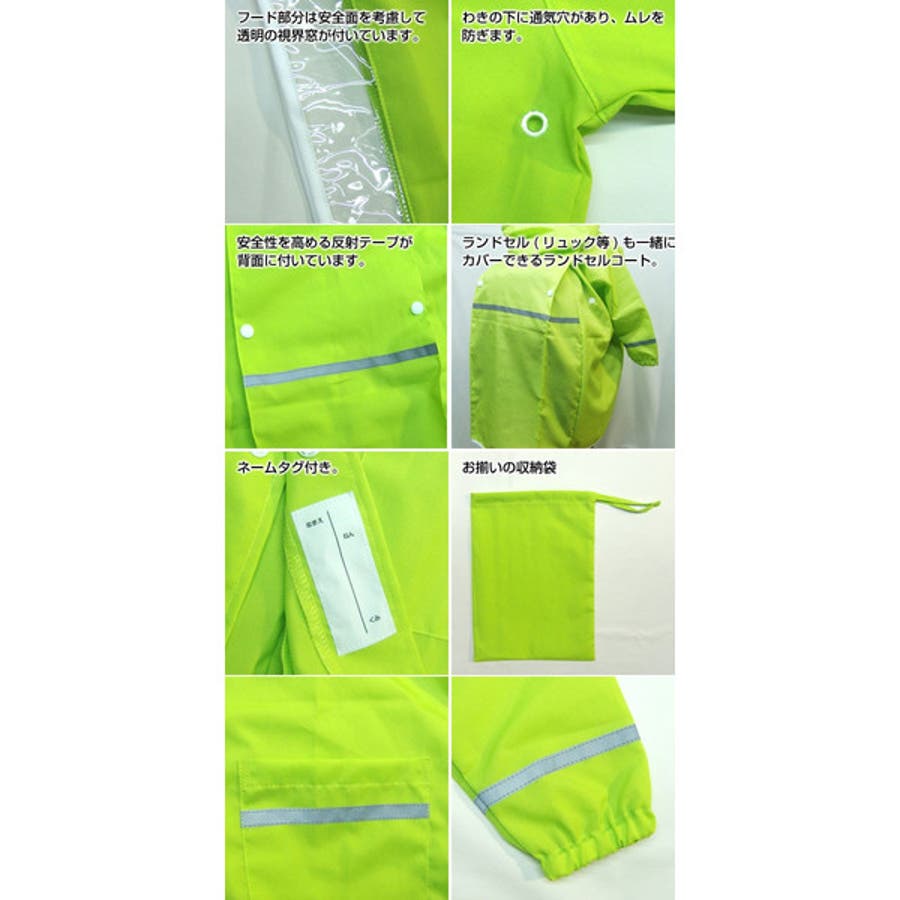 ランドセルやリュックサックを背負ってもボタンを外すだけでその 上から着られるランドセルコートが付いています。