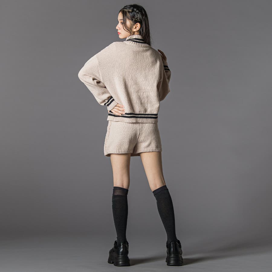 トレンドのダブルジップが主役のニットトップスに、スカート見えのスカパンをセット。