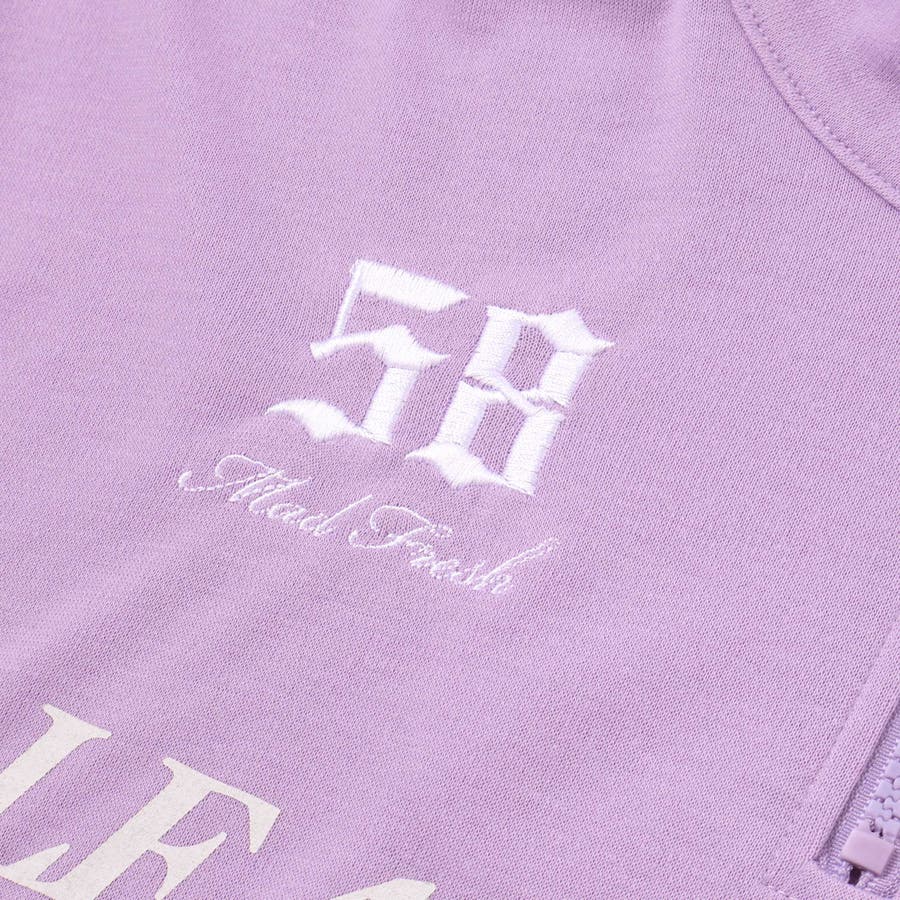 ドロップショルダーのハーフジップトップスと、ロゴゴム裾の半袖Tのセットアップ。