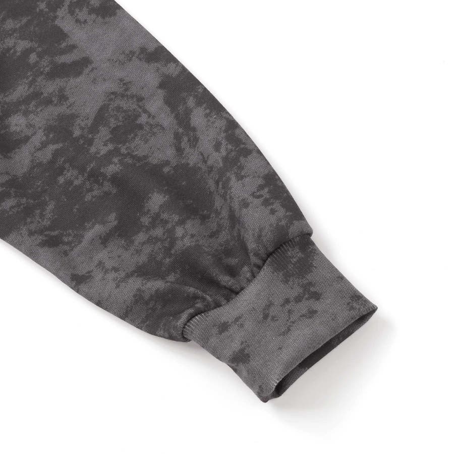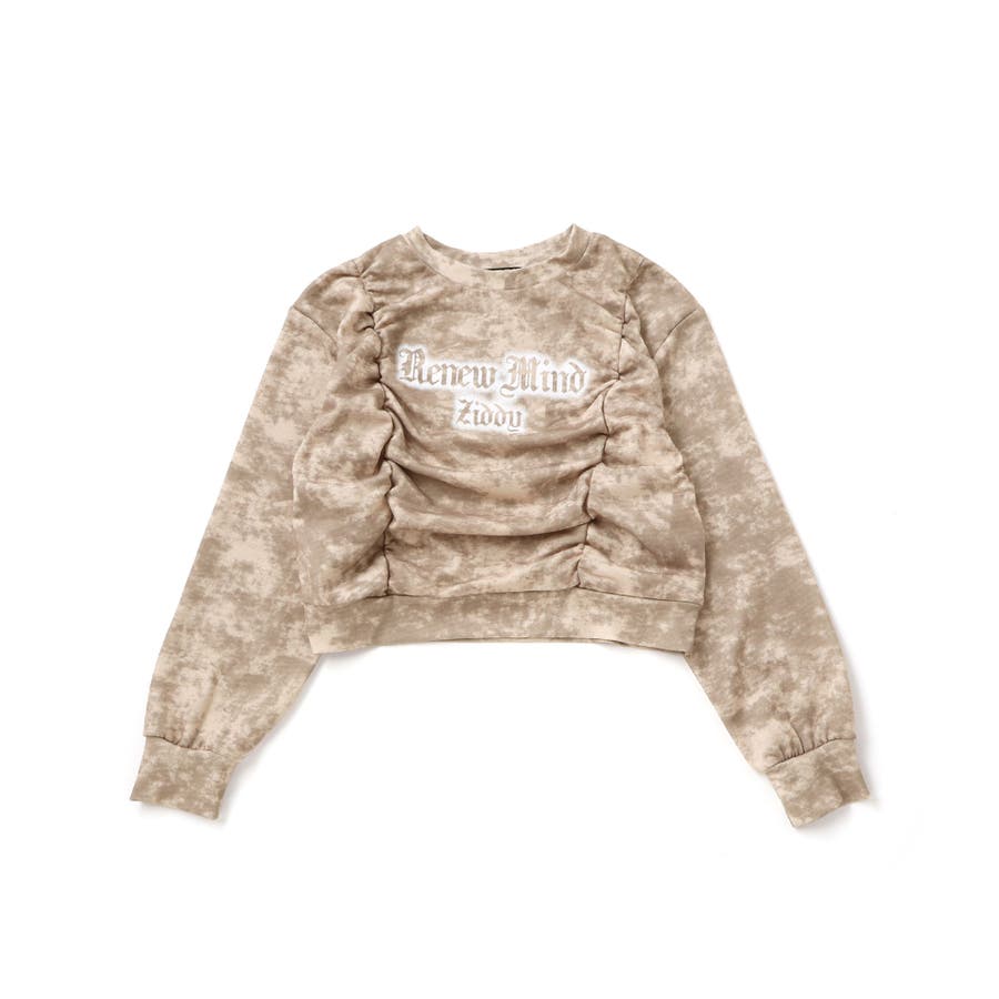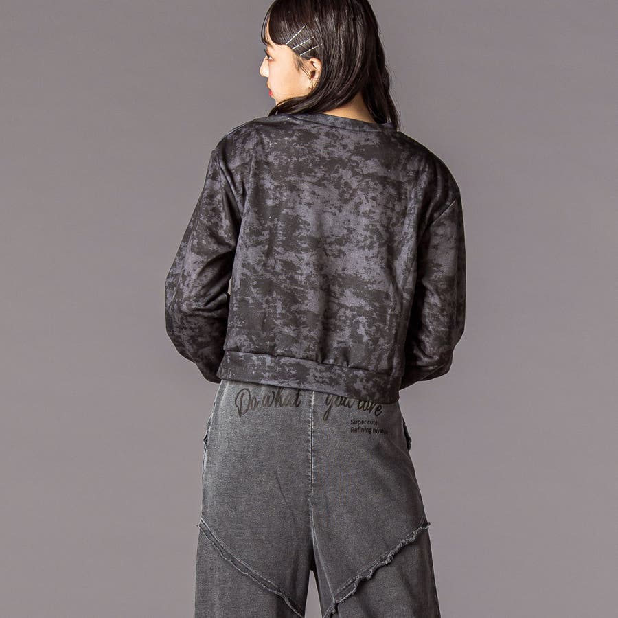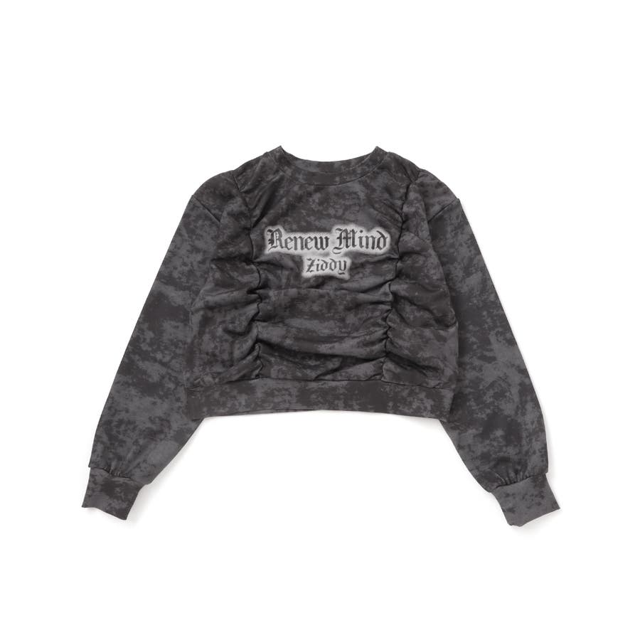 総柄のムラ染めプリントにフロントロゴが効いた、ちょいグランジなショート丈トレーナー。