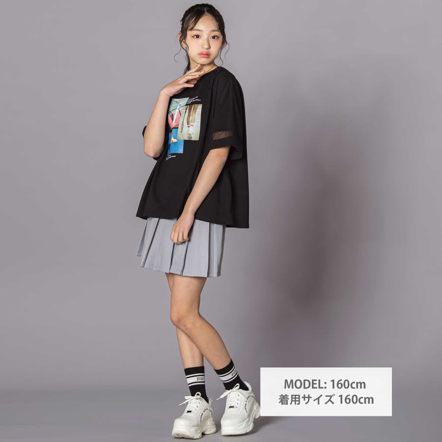 フォトプリントTシャツのアート感と、スカートのフェミニンさがマッチして、パッと目を引くコーデになるよ。
