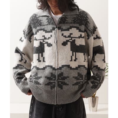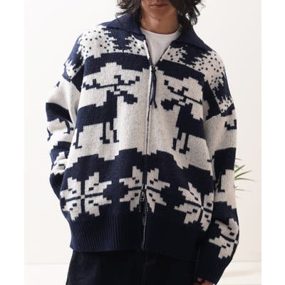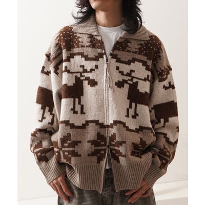 ニット セーター ジャガード 総柄 緩め オーバーサイズ カウチンニット ZIP ダブルZIP ジップアップ ダブルジップ カウチンセーター ノルディック 柄 北欧柄 鹿 動物