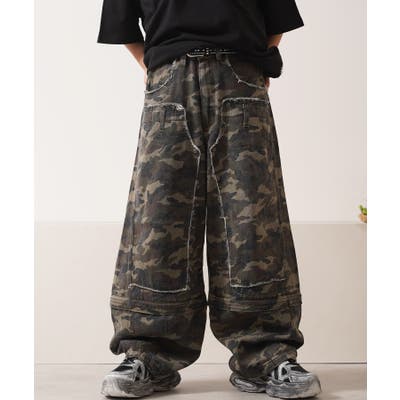 ヴィンテージ加工 ワイドデニム ジーンズ バギーパンツ カーブパンツ 緩めデニム パンツ ボトム ボトムス ピスポケット 後ろポケット 迷彩 カモ カモフラ カモフラージュ デニム 秋冬 新作 秋服 冬服