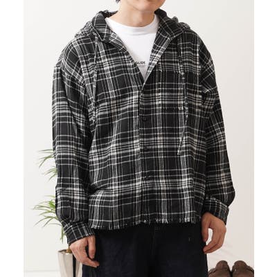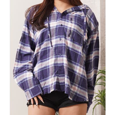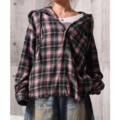 フリンジ加工でフード付きのアクセントが効いたチェック柄シャツパーカー。