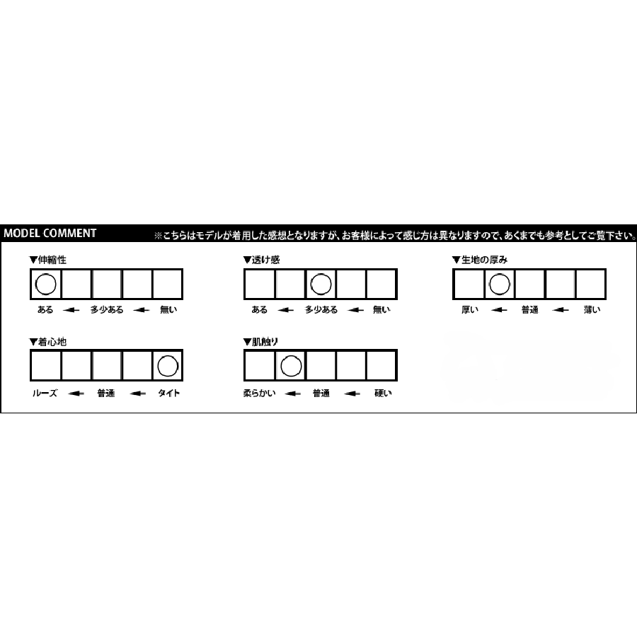 伸縮性…かなりある 透け感…多少ある 生地の厚み…やや厚い 着心地…かなりタイト 肌触り…やや柔らかい