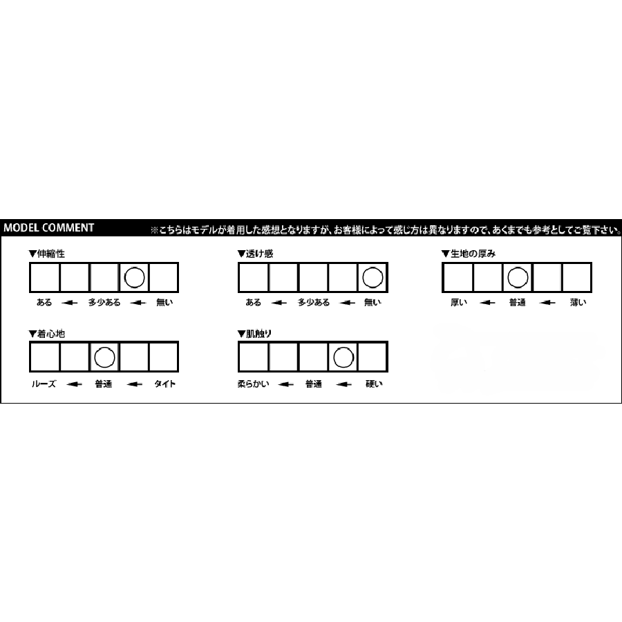 伸縮性…あまり無い 透け感…無い 生地の厚み…普通 着心地…普通 肌触り…やや硬い