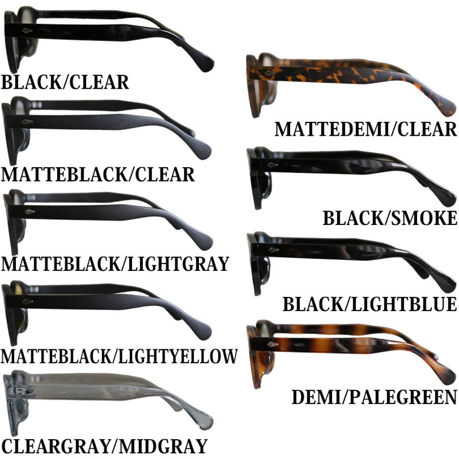 | カラー | ブラック/クリア / マットデミ/クリア / マットブラック/クリア / ブラック/スモーク / マットブラック/ライトグレー / ブラック/ライトブルー / マットブラック/ライトイエロー / デミ/ペールグリーン / クリアグレー/ミッドグレー |