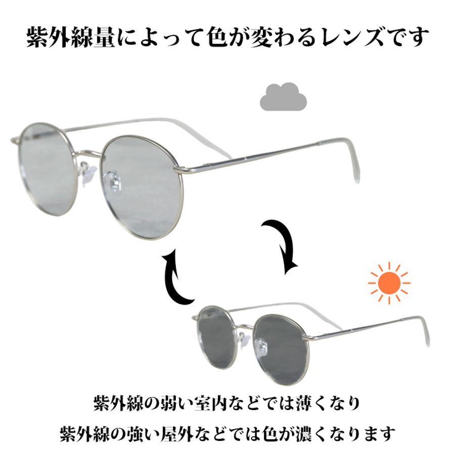 屋内外問わず活躍する『調光・偏光メタルラウンドサングラス』のご紹介です。大人気メタルラウンドサングラスから、紫外線の量によって色が変化する調光・偏光サングラスの登場。丸っこい独特なフレームで存在感を放つラウンド型サングラス。かけるだけで知的で優しい印象をあたえてくれるのも魅力。専用ケース付きなので、レンズに傷がつくのを防いでくれるだけでなく、カバンの中での収納も安心。メンズレディース共におすすめなユニセックスデザインですので、プレゼントにもオススメ。紫外線量によって色が変わるレンズです。紫外線の強い屋外などでは色が濃くなり、紫外線の弱い室内などでは薄くなります。インドア/アウトドアを問わずオールデイの使用が可能です。どんなスタイルにも合う落ち着いたカラーから、コーディネートのアクセントにぴったりのインパクトあるカラーまで大人の遊び心をくすぐるラインナップです。