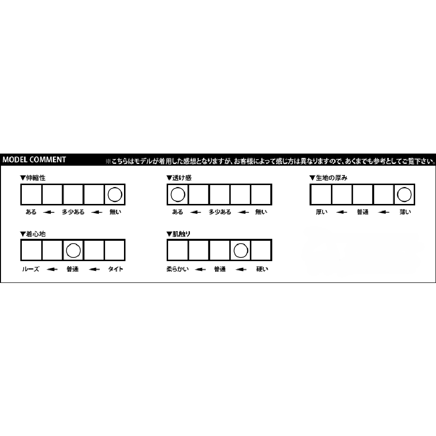 伸縮性…無い 透け感…かなりある 生地の厚み…かなり薄い 着心地…普通 肌触り…やや硬い