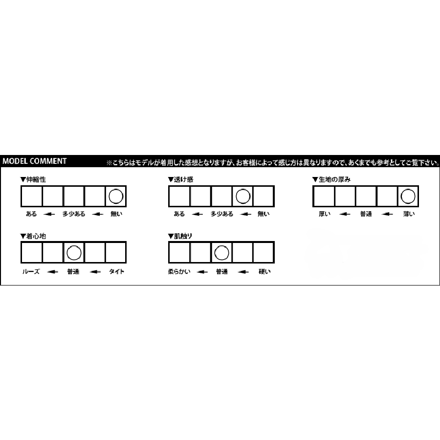 素材感 伸縮性…無い 透け感…あまり無い 生地の厚み…かなり薄い 着心地…普通 肌触り…普通