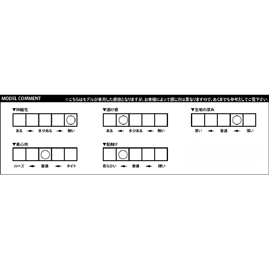 伸縮性…無い 透け感…ややある 生地の厚み…やや薄い 着心地…普通 肌触り…やや柔らかい