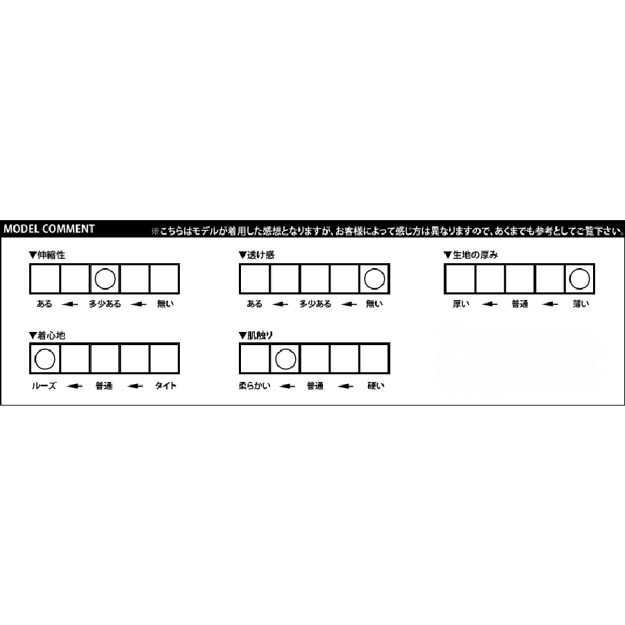 伸縮性…多少ある 透け感…無い 生地の厚み…かなり薄い 着心地…かなりルーズ 肌触り…やや柔らかい