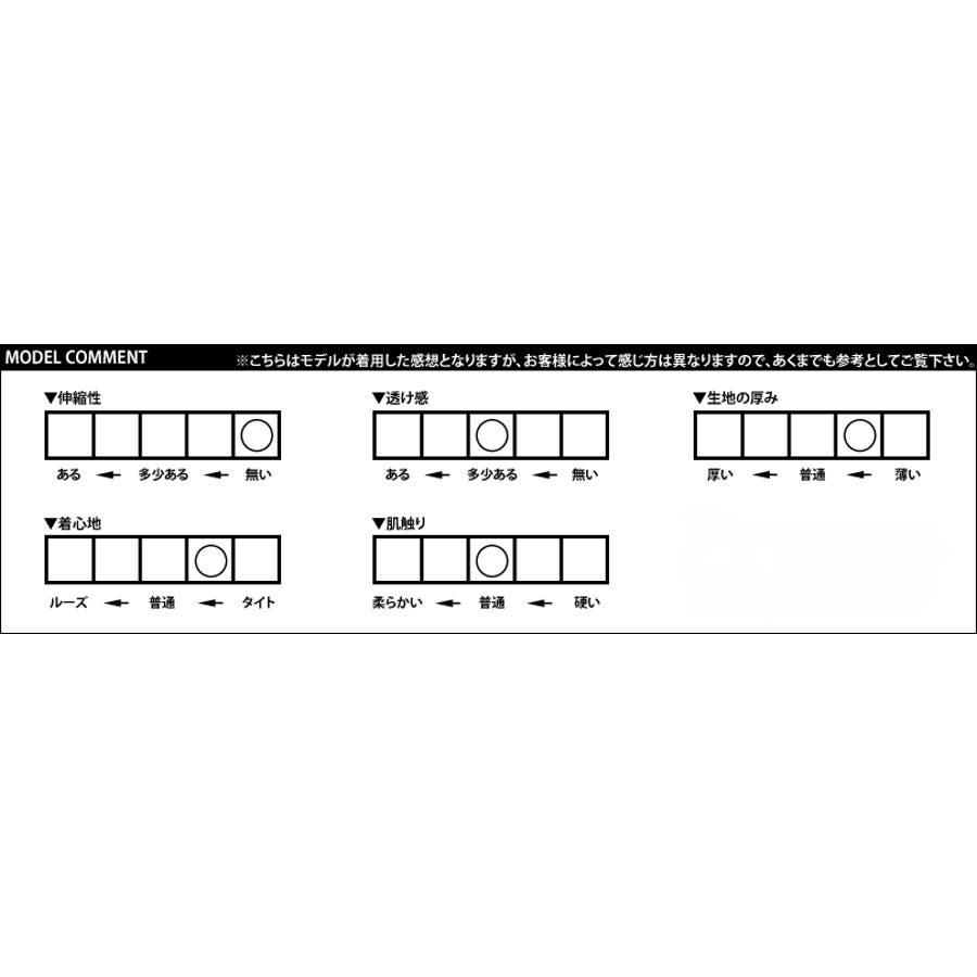 伸縮性…無い 透け感…普通 生地の厚み…やや薄い 着心地…ややタイト 肌触り…普通
