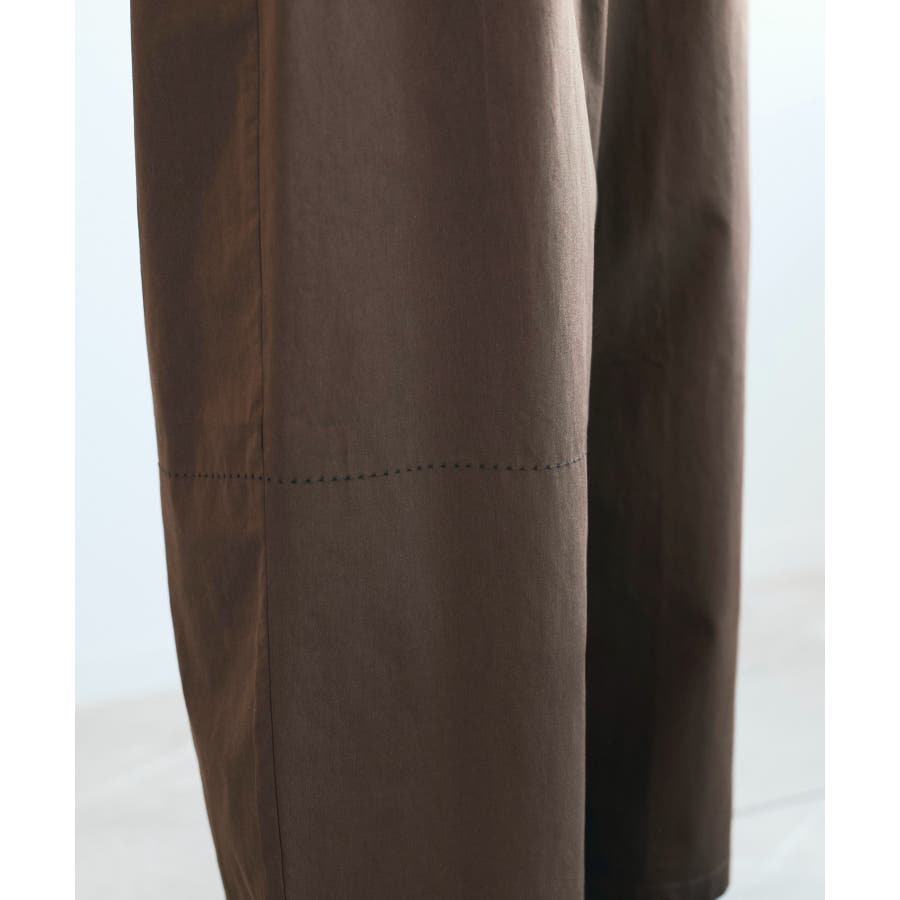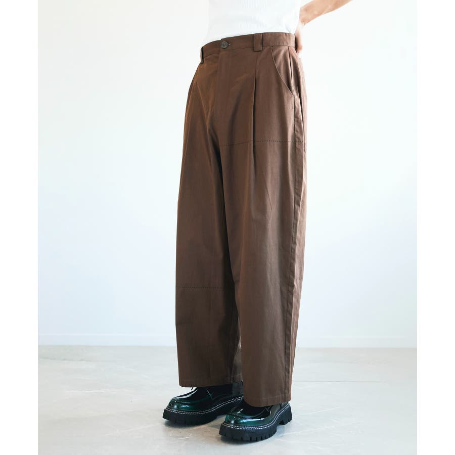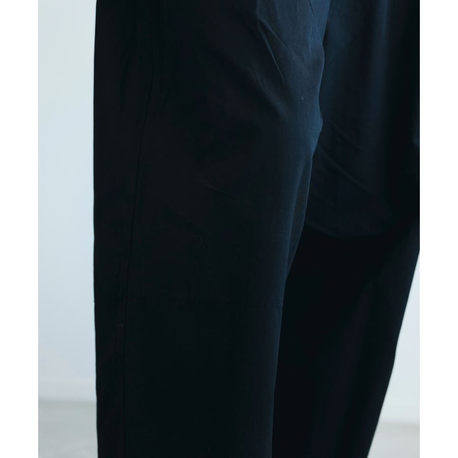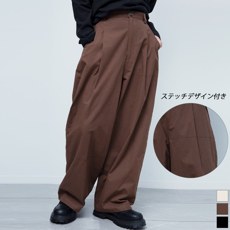 シンプルなデザインではありつつも、変わったステッチが入っているワイドパンツで、個性を出したい人や周りと被りたくない人におすすめです。また、どんなトップスにも合わせやすい万能なワイドパンツです。綿素材でできていて、柔らかい生地なのでカジュアルな雰囲気のコーディネートにぴったりです。左右で違う高さの位置に入っているステッチが特徴で、シンプルなワイドパンツに個性を加えました。ダーツが入っていることでシルエットに立体感ができ、フィット感があり、引き締め効果もあります。