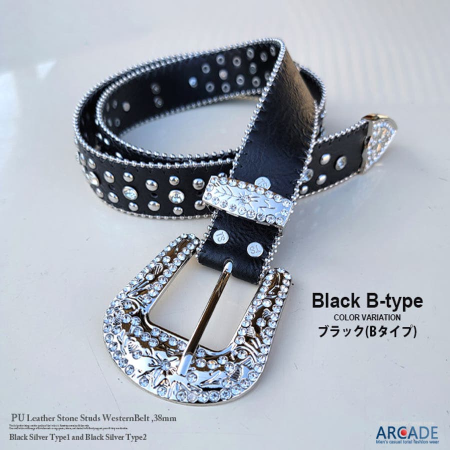 ハードなスタッズ使いのウエスタンデザイン ラインストーン スタッズレザーベルト