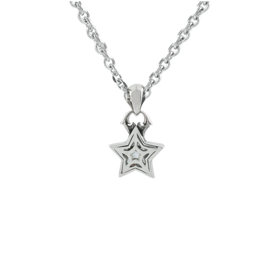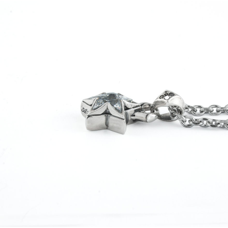 研ぎ澄ました星の気配を、さりげなく。端正にカットした五芒星のCZクリアを、磨き込んだシルバーフレームで包み、コンパクトなサイズでも胸元に確かな存在感を与えます。バチカンにはクラシカルなトレサリーの意匠、背面には光を取り込むスター型の透かしを配し、動くたびに表情が変わるモダンなきらめきを演出。ミニマルさと上質感が心地よく同居するデザインです。制作はアトリエで一点ずつ。成形から石留め、仕上げまで丁寧に重ね、肌に触れたときの滑らかさまで追求しました。単品で凛と纏うのはもちろん、ブラックストーンの〈イブニングスター〉とペアで合わせれば、二人のスタイルにさりげない統一感を添える“おそろい”のアイコンに。日常にも特別な日にも映える、永く愛せる一品です。