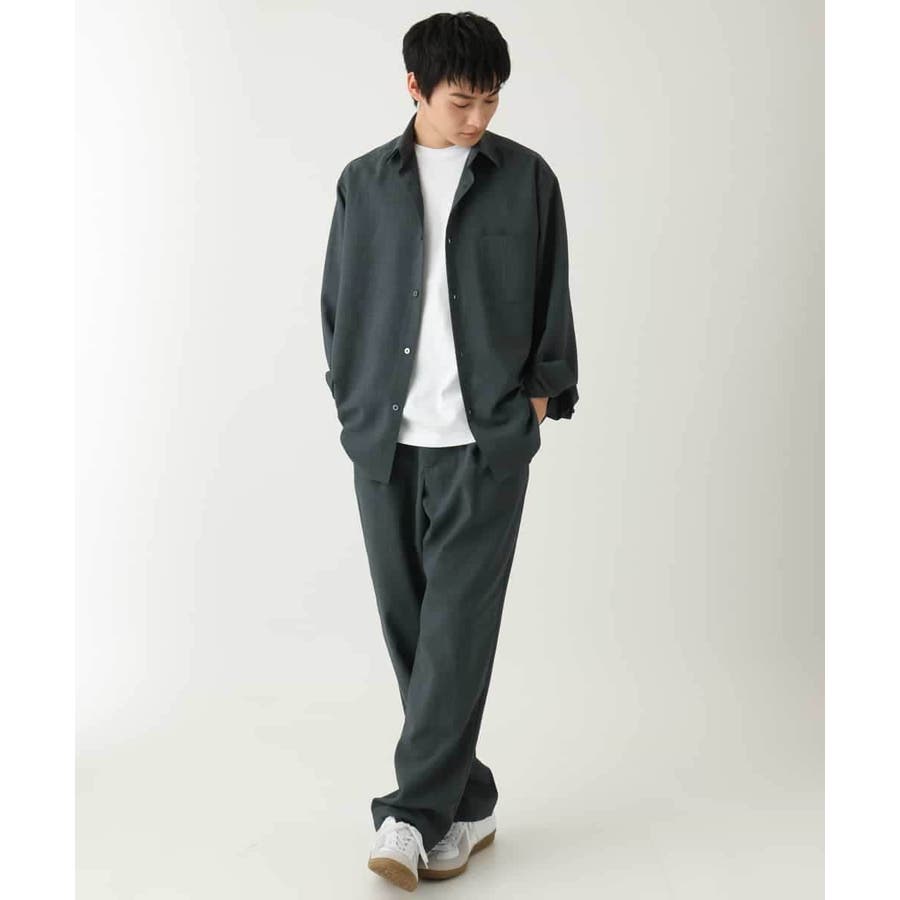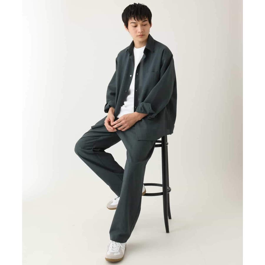 同素材のワイドイージーパンツを合わせたセットアップスタイルが