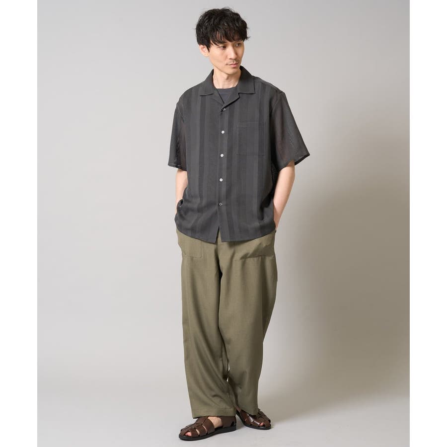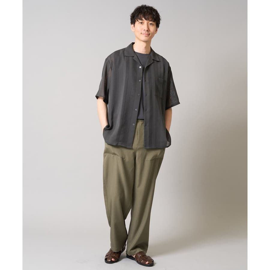 カラミ織りの「透ける」部分を効果的に利用して、ランダムストライプ柄を表現したオープンカラーシャツ。
