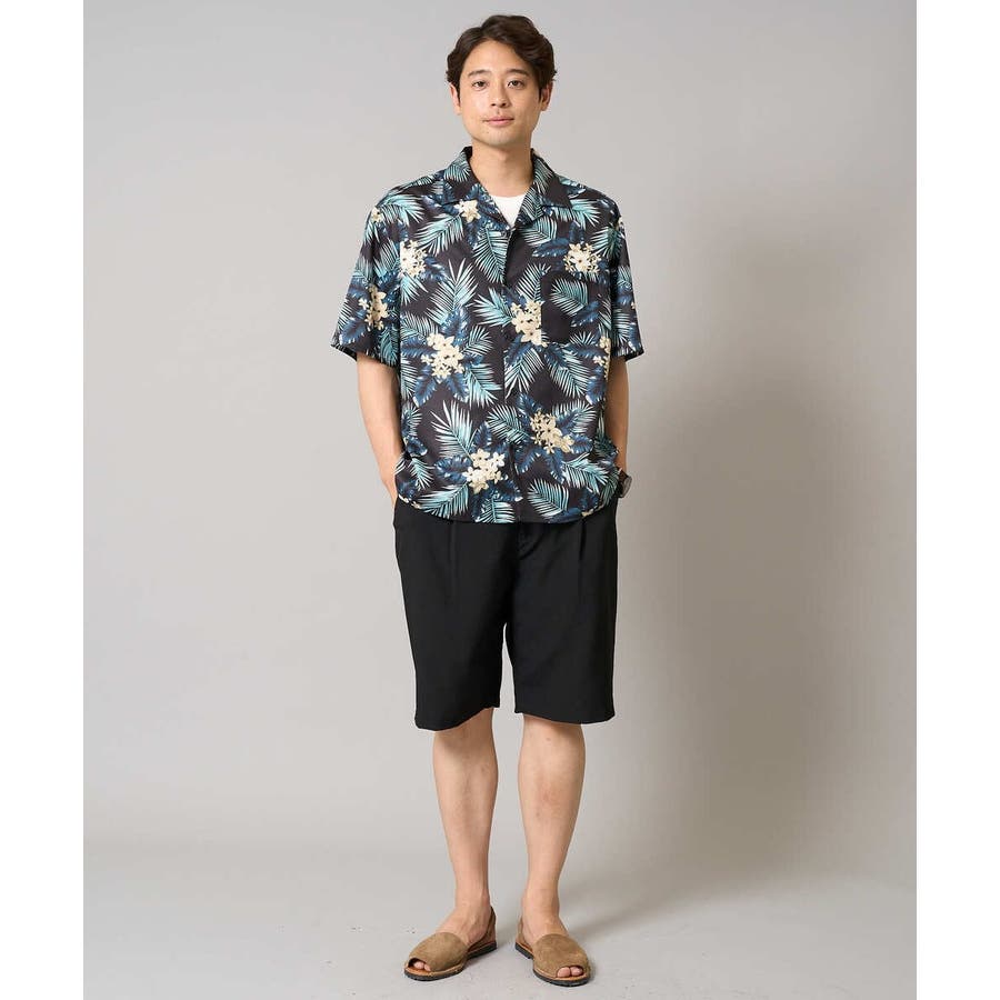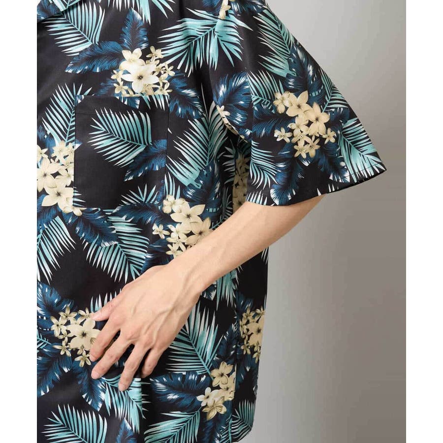 ブラックベースのアロハ柄は大人が着やすい程よくインパクトのある配色感がポイント。