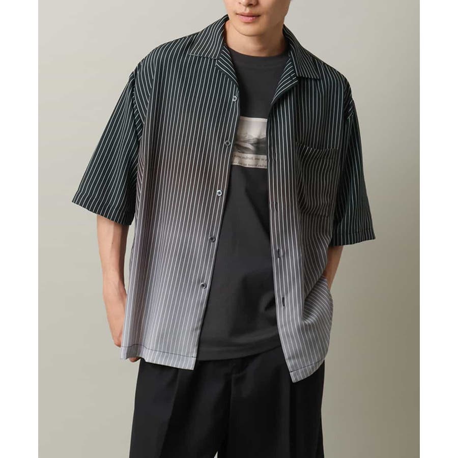 インパクトのあるグラデーションとストライプ柄をMIXしたプリントを施したオープンカラ―シャツ。